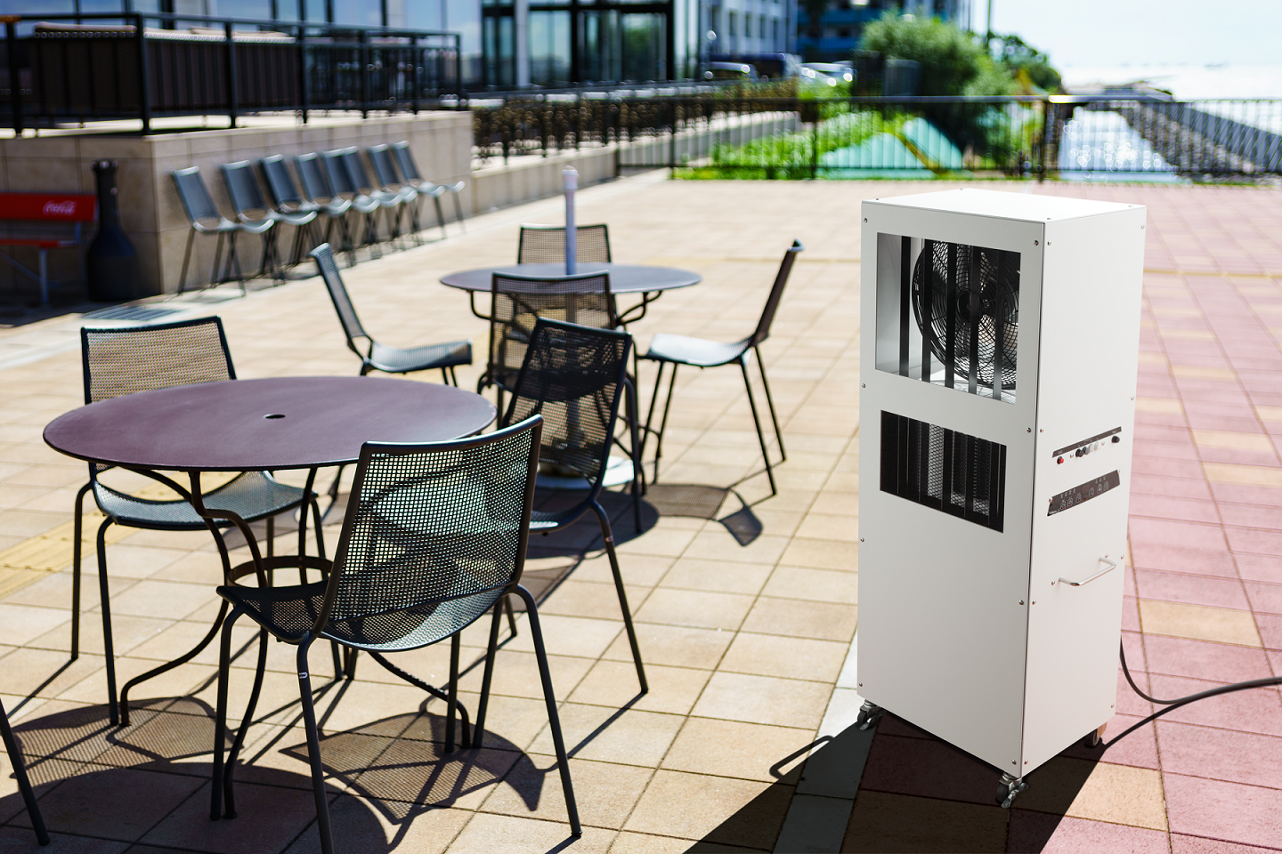 他社ではなかなか見られない、屋外用に特化したデザイン性の高い電気暖房機や冷風機をご用意しています。特に今回の展示会では、商業施設・イベント用途を意識しコンパクト・デザイン性を重視した、屋外用冷風機「DRY COOL(ドライクール)」をぜひご覧ください。