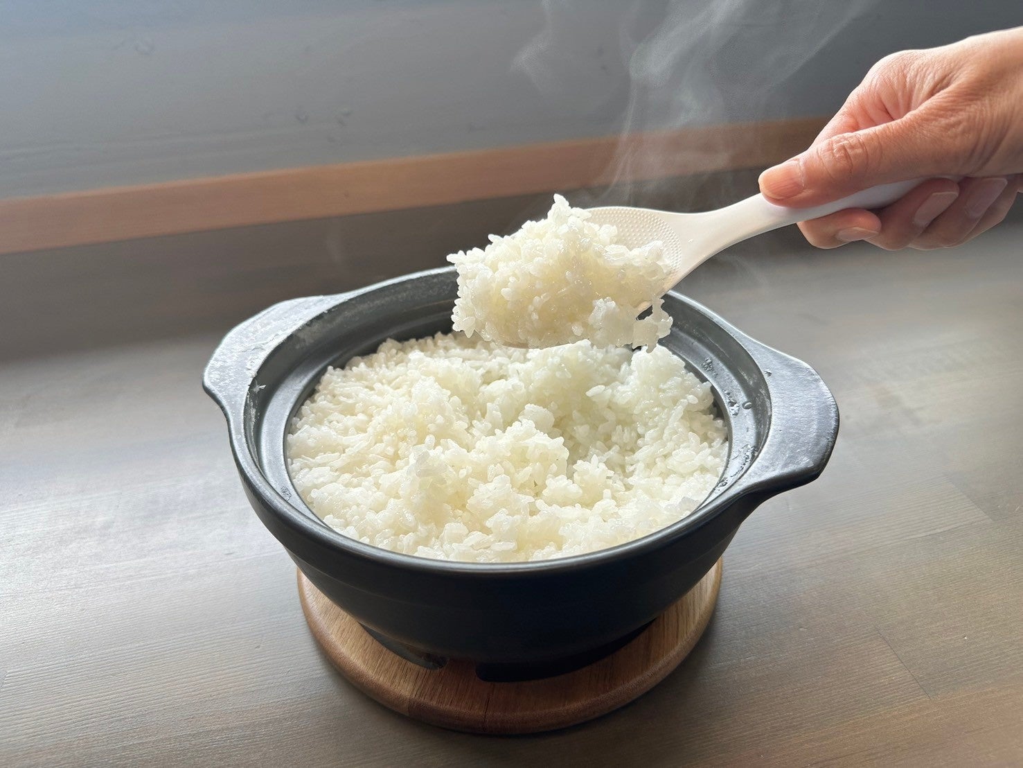 地元産の米を、注文が入ってからお客様の目の前で土鍋で炊きます。タイマーを使いお客様ご自身で炊いたり蒸らしたりしていただき「土鍋で炊くこと」もお楽しみいただきます。土鍋で炊くことで、ふっくら艶やかな美味しいご飯が炊けると共に、保温性が高く食べ終わるまで温かいご飯を味わっていただけます。