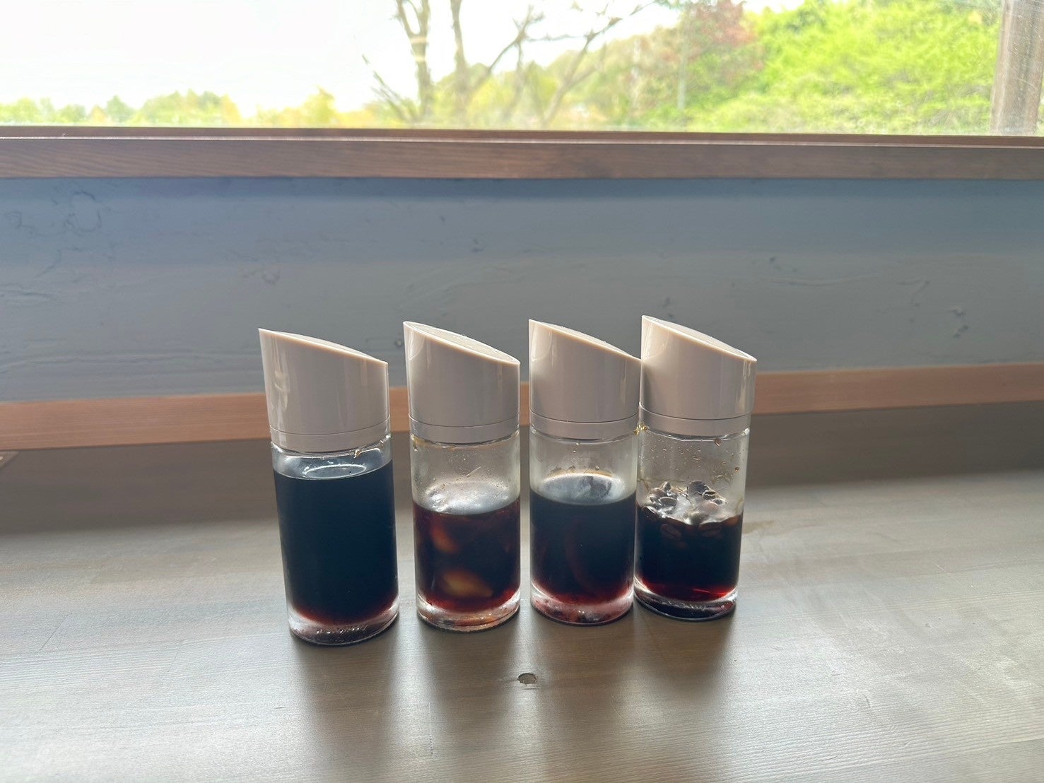たまごかけご飯をより一層美味しくいただけるよう、4種のオリジナルのたまごかけご飯用醤油(だし醤油、カツオニンニク醤油、生姜醤油、コーヒー醤油)をご用意いたします。喫茶店としてこだわりのコーヒー醤油は、納豆ご飯のような風味になる驚きの美味しさです。またセットには地元野菜などを使った季節のお味噌汁やお漬物をご用意いたします。