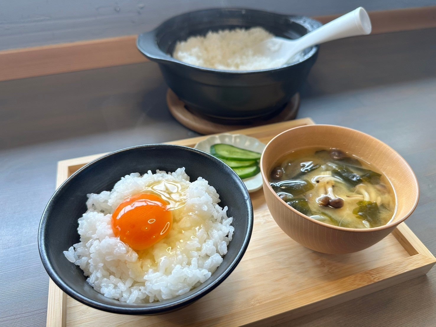 お客様がご自身で炊く土鍋ごはん1合、美人たまご(おかわりOK)、季節のお味噌汁、おつけもの