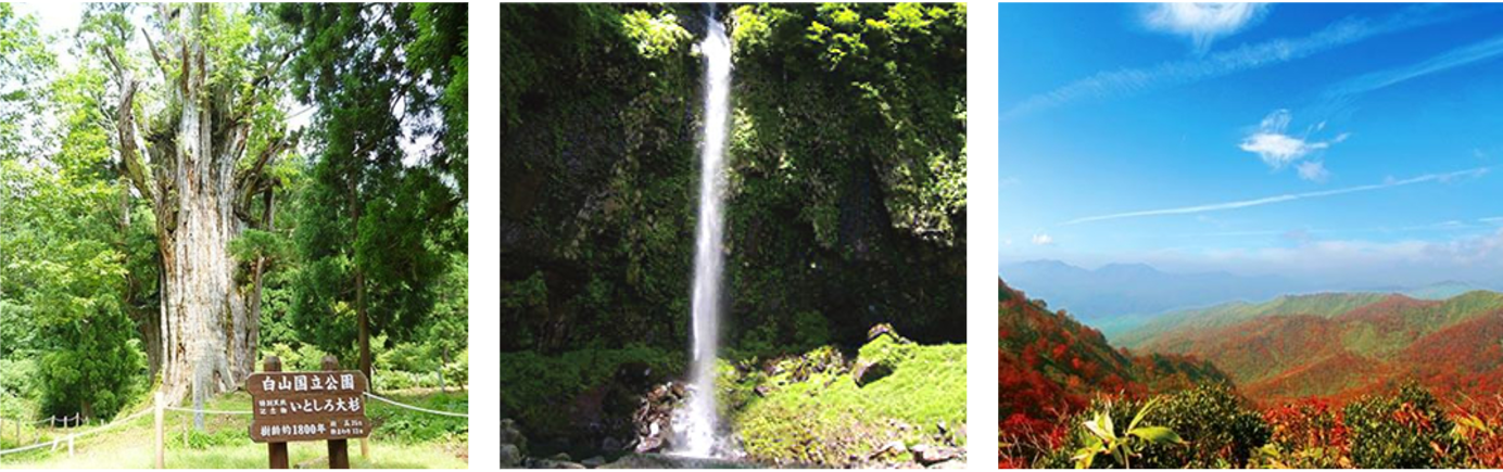 キャンプ場周辺には自然スポットがたくさんあります。清流『石徹白川』をはじめ、大蛇が住むという伝説のある村間ヶ池、推定樹齢は1,800年の特別天然記念物(国指定)の石徹白大杉、白山中居神社の巨木の森、落差60m日本の滝百選の阿弥陀ヶ滝、標高1,709m大日ヶ岳など、全て回るには、1日では足りないほど。