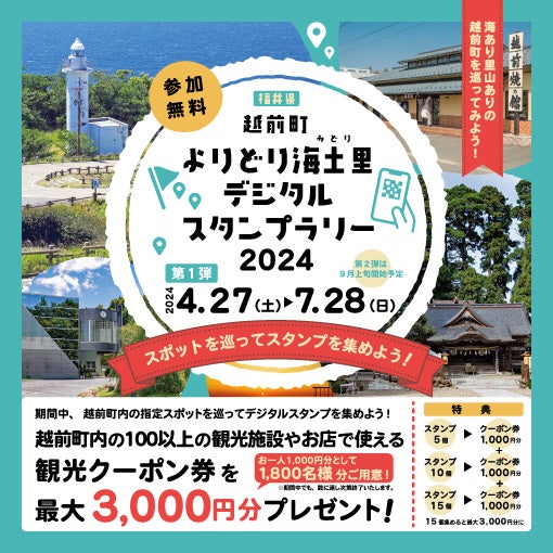 福井県越前町の一般社団法人越前町観光連盟(DMO ECHIZEN)は、2024年3月16日(土)に北陸新幹線が福井に延伸したことから、越前町の魅力を周遊しながら知ってもらうため、越前町一帯を会場としたデジタルスタンプラリー『越前町よりどり海土里デジタルスタンプラリー』を今年も開催いたします。