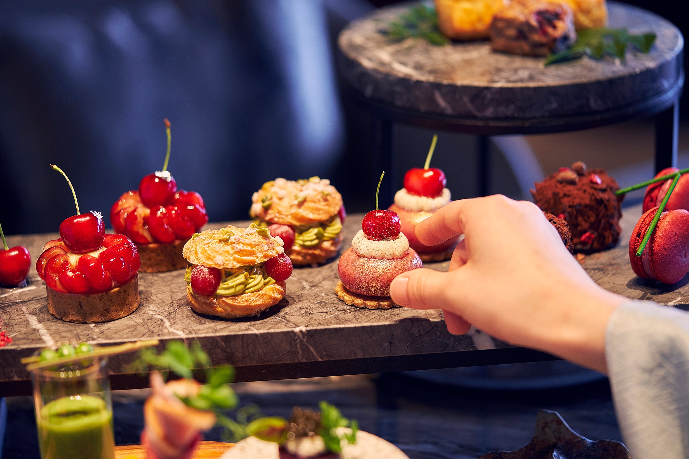 初夏の季節のさくらんぼとチェリーを贅沢に使った色鮮やかな7種類のスイーツと、五味(苦味、うま味、酸味、塩味、甘味)を表現したこだわりのセイボリー5種で構成しています。
