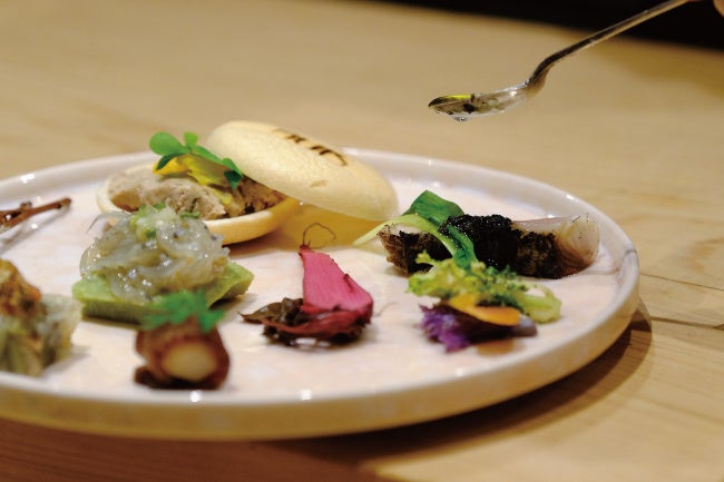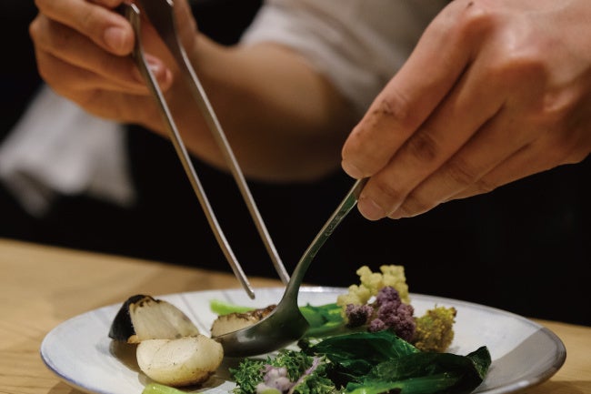 シェフ保﨑氏が信頼を置いている農家や漁師、畜産家やハンター達の想いを感じることの出来る食材を、こだわりの作家や職人が織り成す器と共に楽しめるのも魅力の一つ。