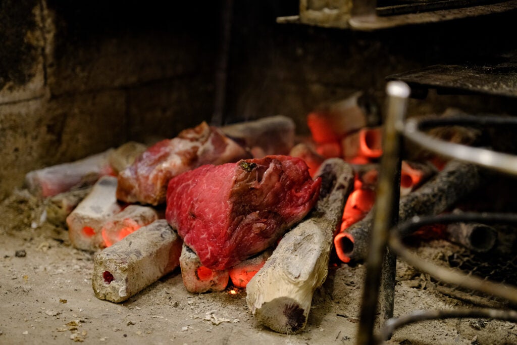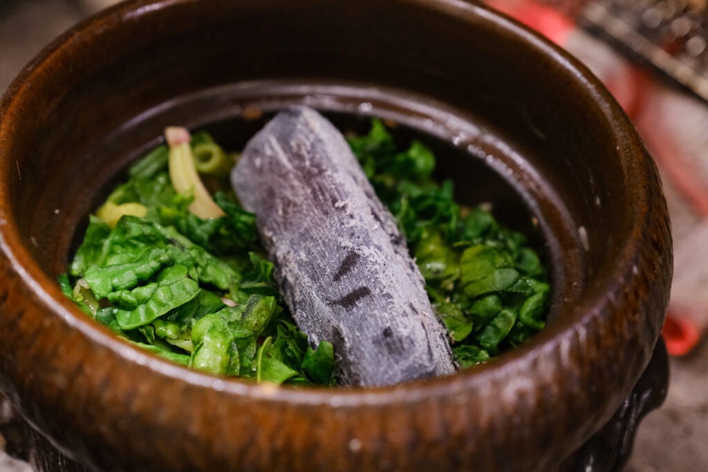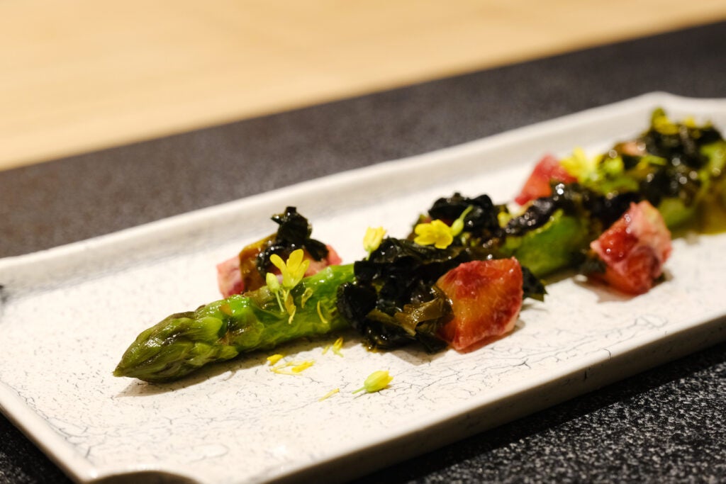 炭焼き台が目を引くオープンキッチンのカウンターには旬の食材がずらりと並び、目の前で炭火の香りや音を五感で感じながら、ライブ感あふれる調理の様子を愉しむことが出来る。