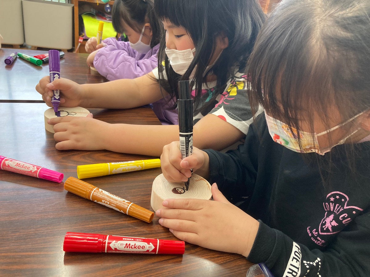 学童保育の子供たちが、身近な女性に向けた感謝のメッセージをヒノキ入浴木に記入します。