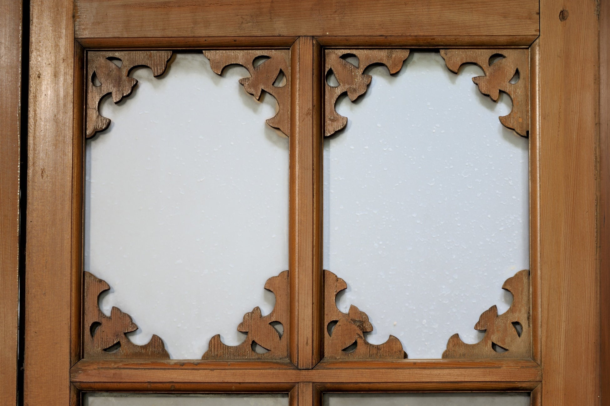 ▼窓際に舞うのは、窓の隅板のモチーフになったコウモリ。(漁樵の間前)