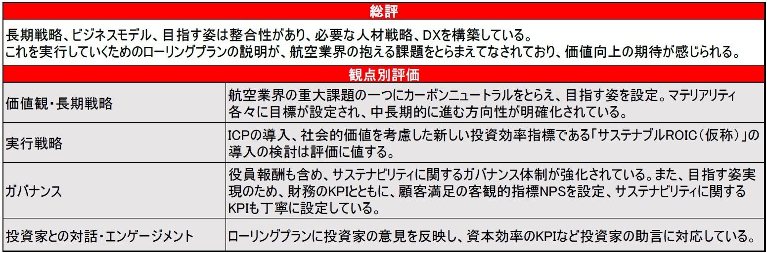 JALグループは、中期経営計画ローリングプランにおいて、ESG戦略を最上位に位置付けています。2030年に向けたあるべき姿JAL Vision 2030の実現に向けて、事業のサステナビリティを高めるとともに、社会的価値と企業価値の両立の追求に中長期的に取り組んでいます。これらの取り組みが社会と企業のサステナビリティを同期化させ、必要な変革を行いつつ長期的かつ持続的な価値向上を実現する先進的企業であると評価され、選定に至りました。