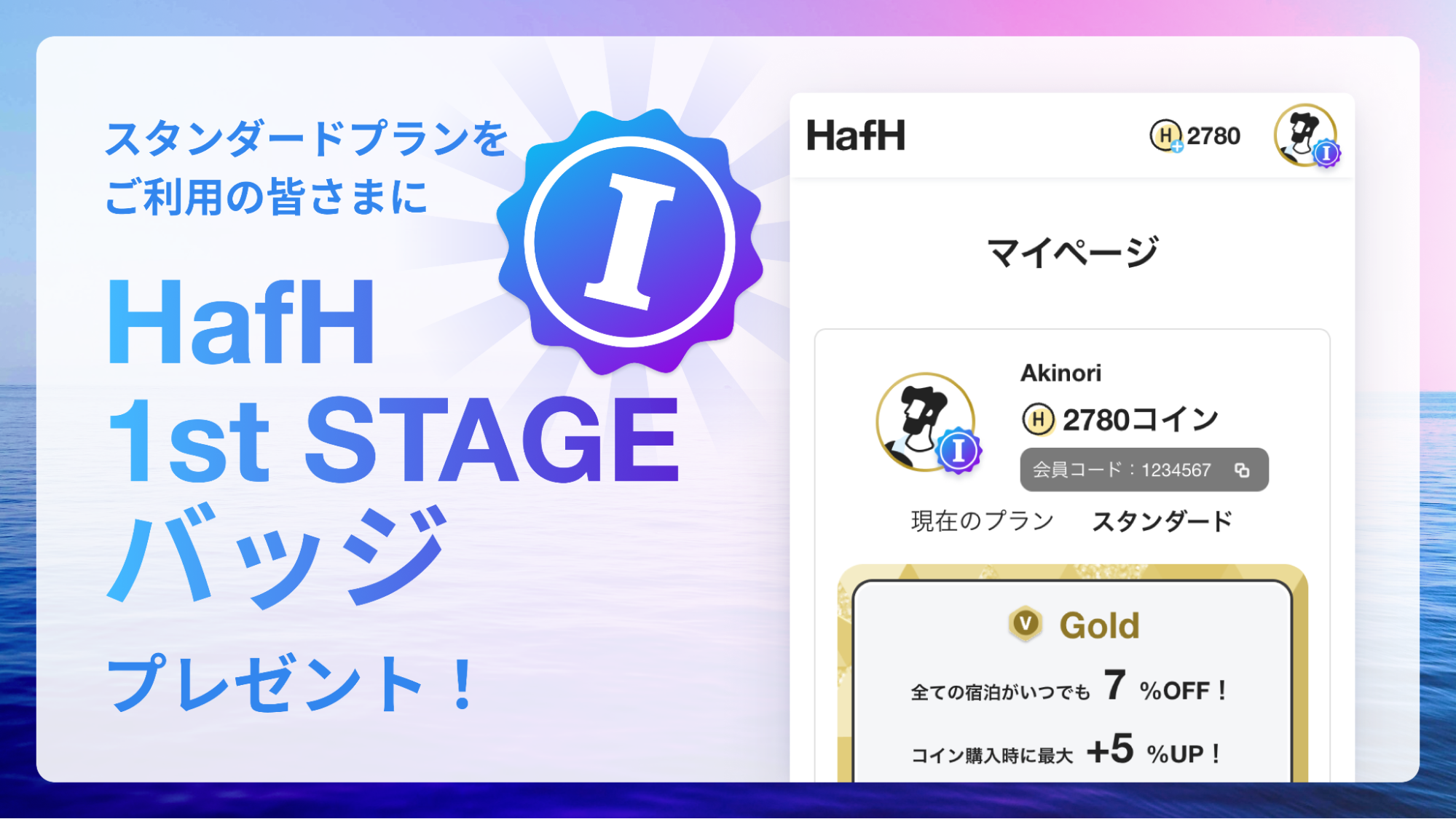 会員の皆様向けのメンバーシップインセンティブを強化していくための新たな取り組みとして、1st STAGE終了時にスタンダードプランをご利用中の皆様へ、感謝を込めてHafH内で表示されるデジタルバッジを配布します。