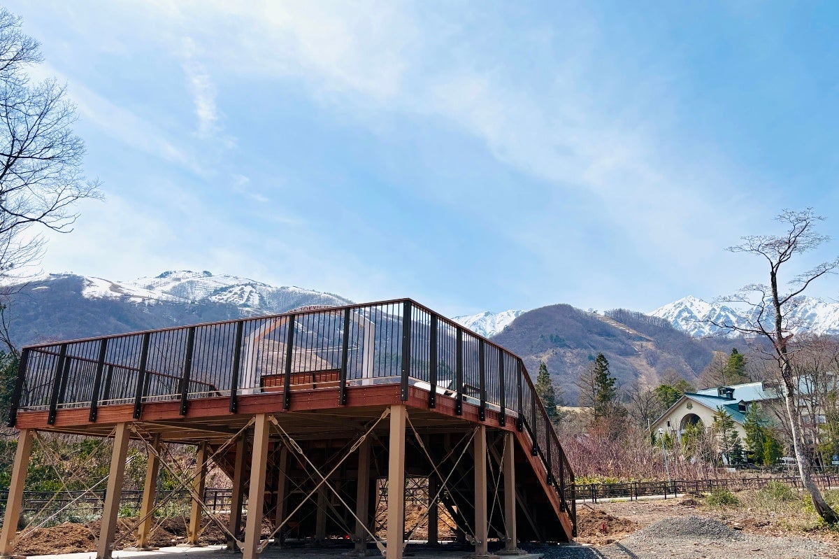 この一連の改修計画の仕上げとして、2024年春、北アルプス白馬三山の眺望が最も良いガーデン最西端に、ブランコ付きの「北アルプス展望デッキ」を完成させ、4月27日(土)からお客様にご利用いただきます。