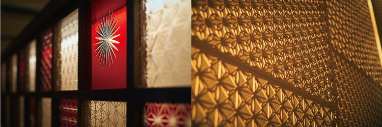 錦糸町を拠点とする廣田硝子さんの江戸切子を前面に配したフロントカウンター。江戸切子は、1800年代に生産が始まった東京都の指定伝統工芸品です。透明なガラスの外側を、赤や紺などの色のついたガラスが覆う2層構造になっており、ガラスの表面を削ることで出てくる透明な部分が、きれいな紋様となって表れます。職人が手仕事で生み出す繊細な紋様の美しさに加え、その奥深さから、国内外を問わず人気のある伝統工芸品です。また、背面の壁面には、日本を代表する浮世絵の大家として知られる葛飾北斎(1760-1849)が出版した絵手本「北斎漫画」で紹介された麻の葉柄のデザインを全面に配置し、日本ならではの繊細な世界観を感じられるフロントカウンターに仕上がりました。