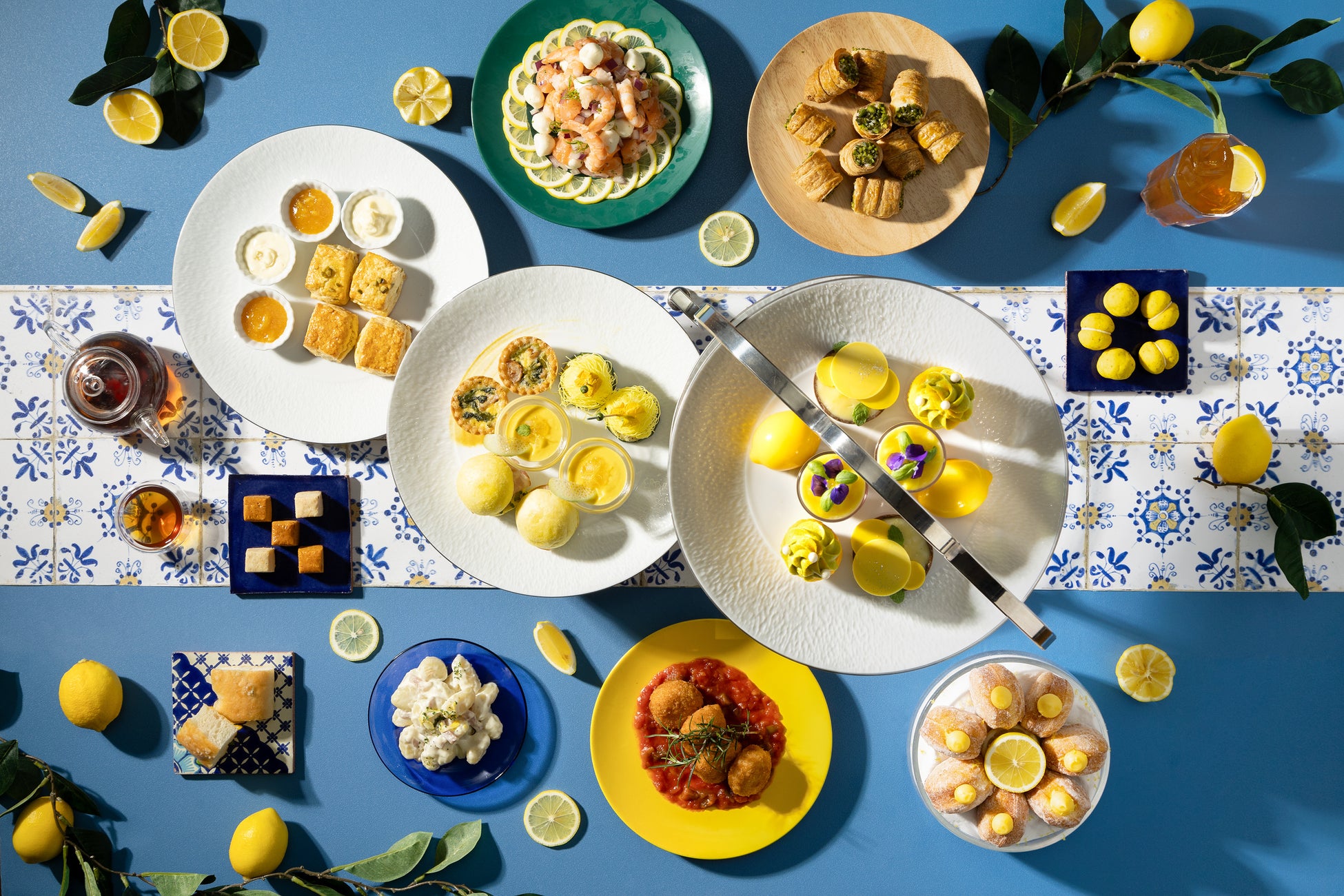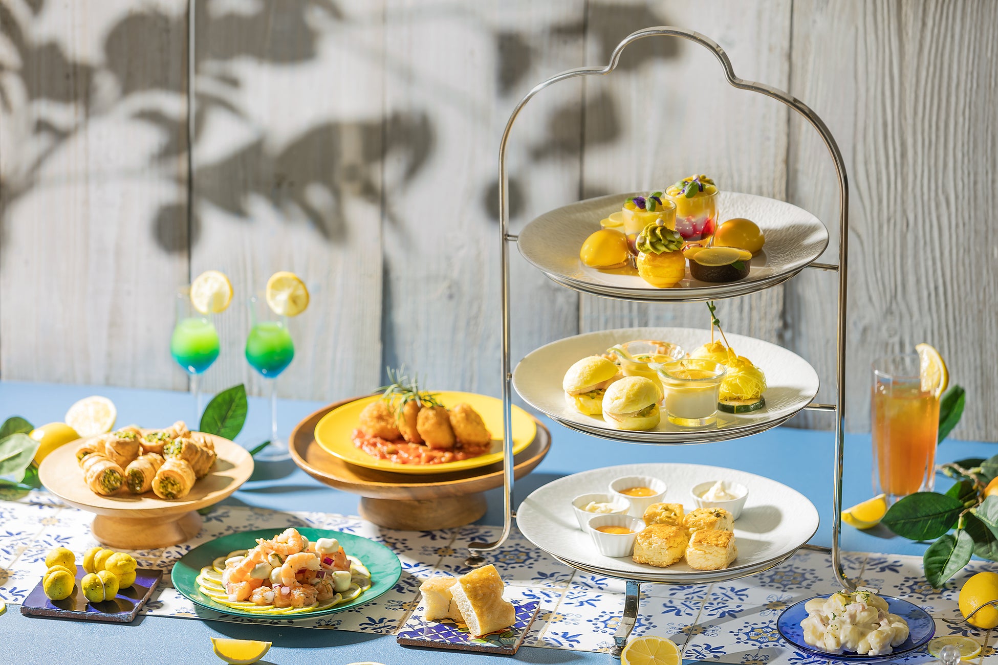 爽やかな酸味や、柑橘の香りが暑い夏にうれしいレモンを用い、コバルトブルーのシチリアの海岸に、夏の日差しが煌めく情景にインスピレーションを得たアフタヌーンティー&ブッフェをご提供いたします。3段アフタヌーンティースタンドには、太陽の光を鮮やかなレモンのビタミンカラーで表現したエレガントなスイーツ&セイボリーが揃い、レモンカスタードクリームが詰まったボンボローニやスパイシートマトソースで味わうアランチーニ(ライスコロッケ)など、イタリアンなメニューをブッフェスタイルで心ゆくまでお召し上がりいただけます。