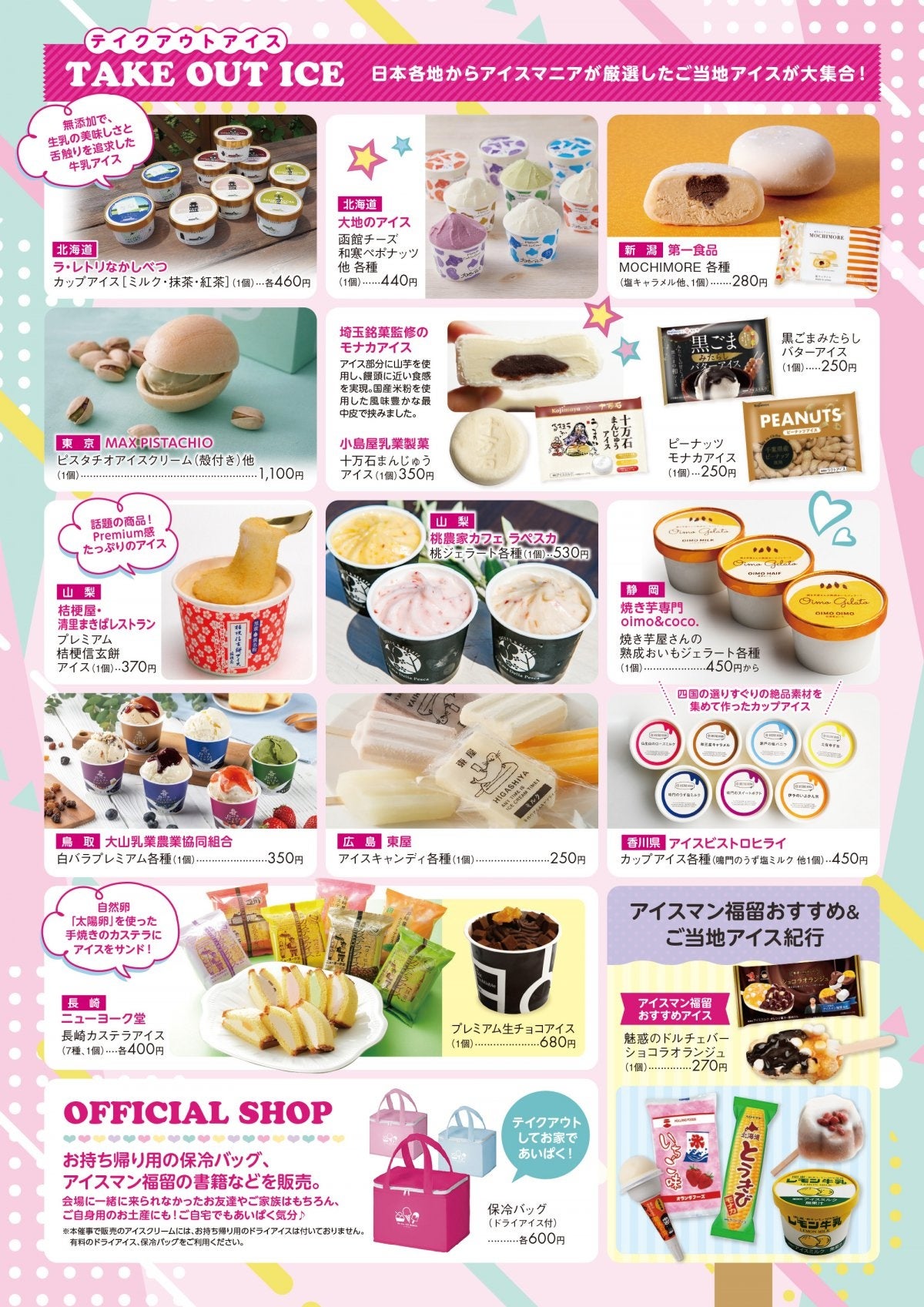※テイクアウト:アイスのお持ち帰りをご希望の方には、会場にて「保冷バッグ+ドライアイス」を販売しておりますのでご利用ください。