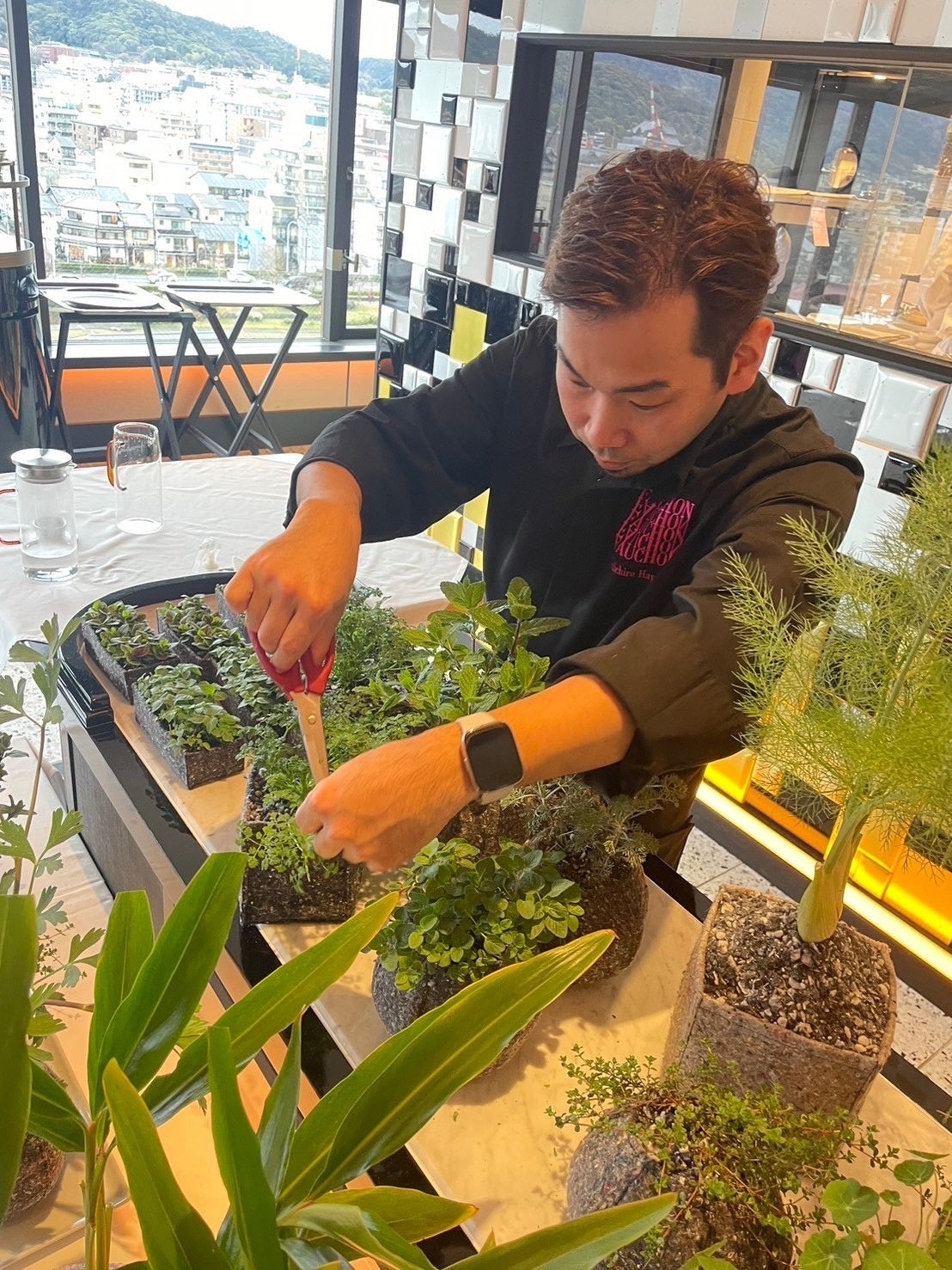 3月26日(火)にフォションホテル京都で開催されたイベントでは、井入農園(所在地:滋賀県守山市)で栽培されたハーブを用意し、摘み立てのハーブを使用した料理や紅茶が提供されました。今回、TUTTIはそのハーブの培地として使用されており、フォションホテル京都のシェフからは、TUTTIが従来廃棄されるポリエステル繊維を培地としてリサイクルして作られていることに加えて、実際のハーブをダイニングに並べる際に本物の土よりも衛生的であることに高評価をいただきました。TUTTIを使用した食に関するイベントは初めてで、食事を楽しみながらサステナビリティに親しみを感じる取り組みを、プラスグリーンプロジェクトを通じて今後も拡大していきます。