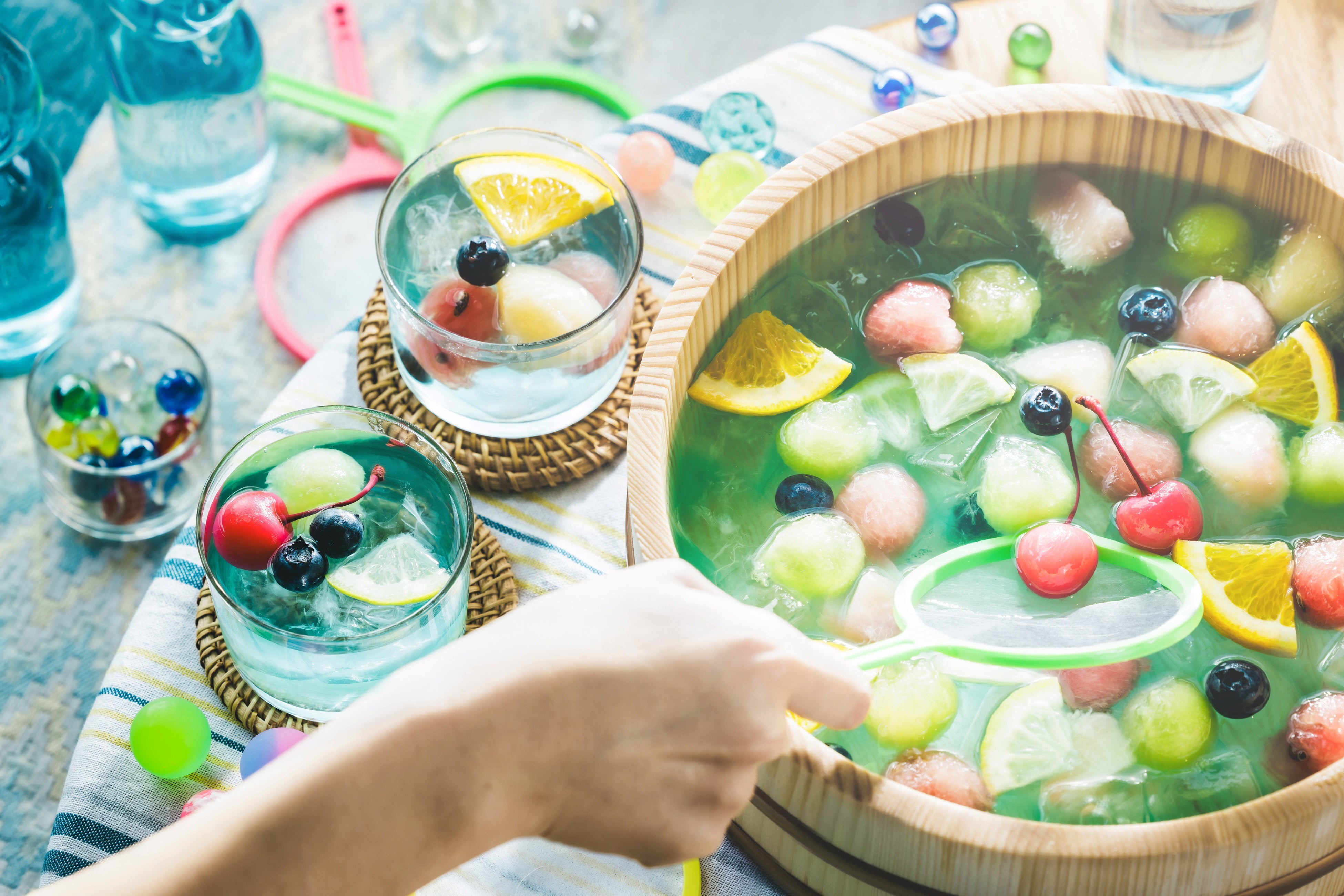 お祭り屋台のスーパーボールすくいをモチーフとした、「フルーツボールすくい」を用意します。大小カラフルなスーパーボールに見立てて、スイカ、メロン、ブルーベリーなどを浮かべました。フルーツをたっぷりと詰め込んだサワー桶を囲いながら、ポイが破れないかドキドキしながらフルーツをすくって仲間とシェアして楽しめます!