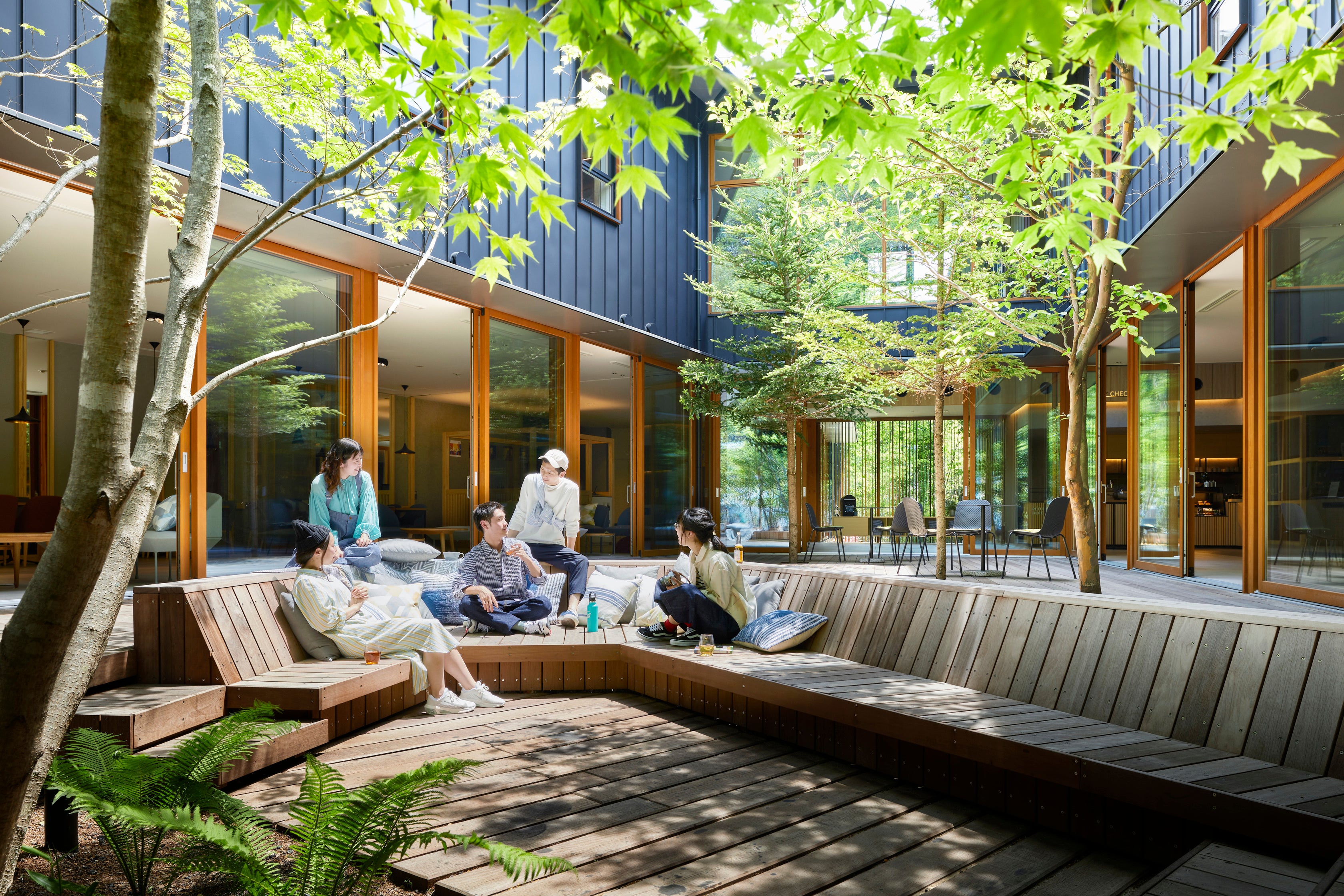 「居酒屋以上 旅未満 みんなでルーズに過ごすホテル」をコンセプトとする、若い世代のためのホテル。24時間利用可能なパブリックスペース「TAMARIBA(タマリバ)」がその象徴。軽井沢星野エリアの入り口に位置し、徒歩圏内でショッピングや温泉、食事が楽しめます。
