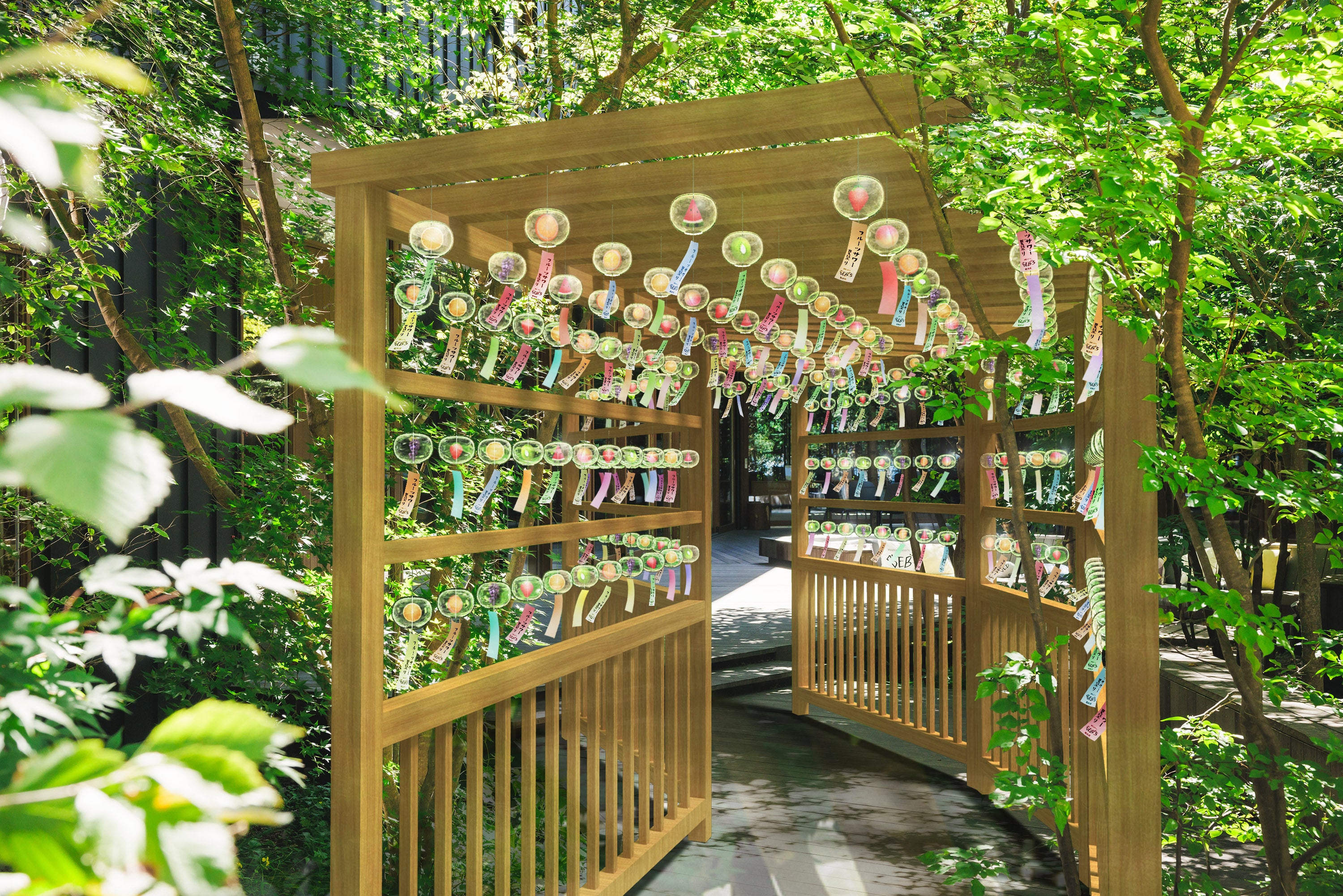 パブリックスペース「TAMARIBA」の中庭に、フルーツ風鈴のフォトスポットが登場します。夏の風物詩である風鈴の中にフルーツを装飾した、BEBオリジナルの風鈴です。中庭に組まれたやぐらにずらりと並ぶ風鈴が奏でる綺麗な音色と、フルーツのカラフルな色合いが涼を運びます。