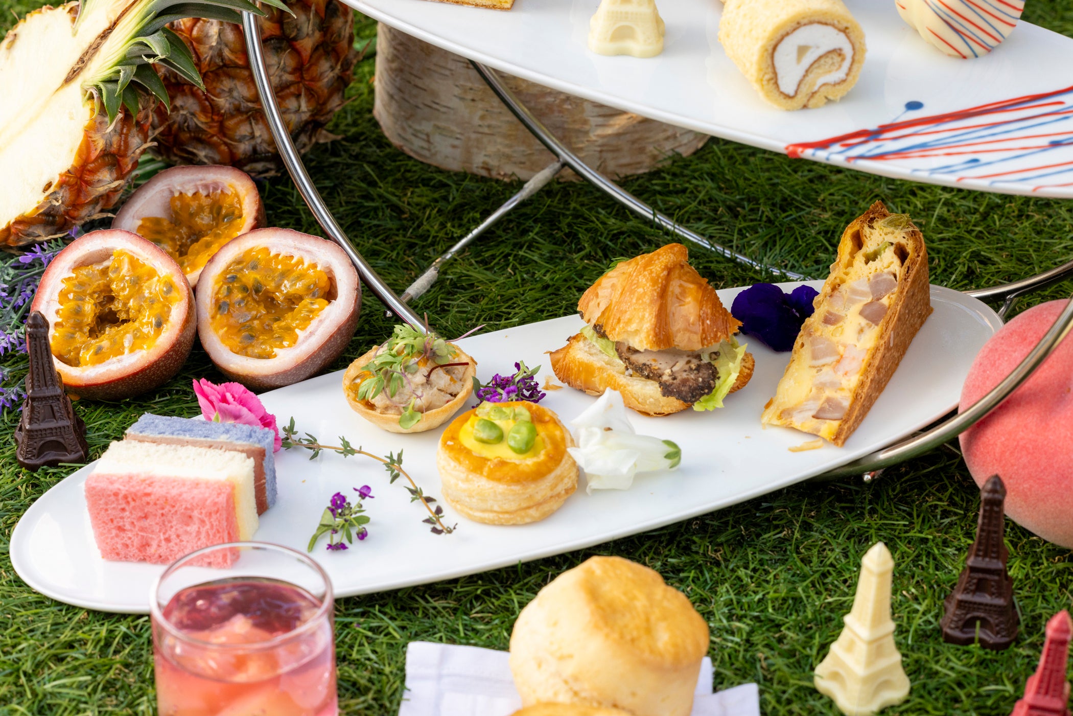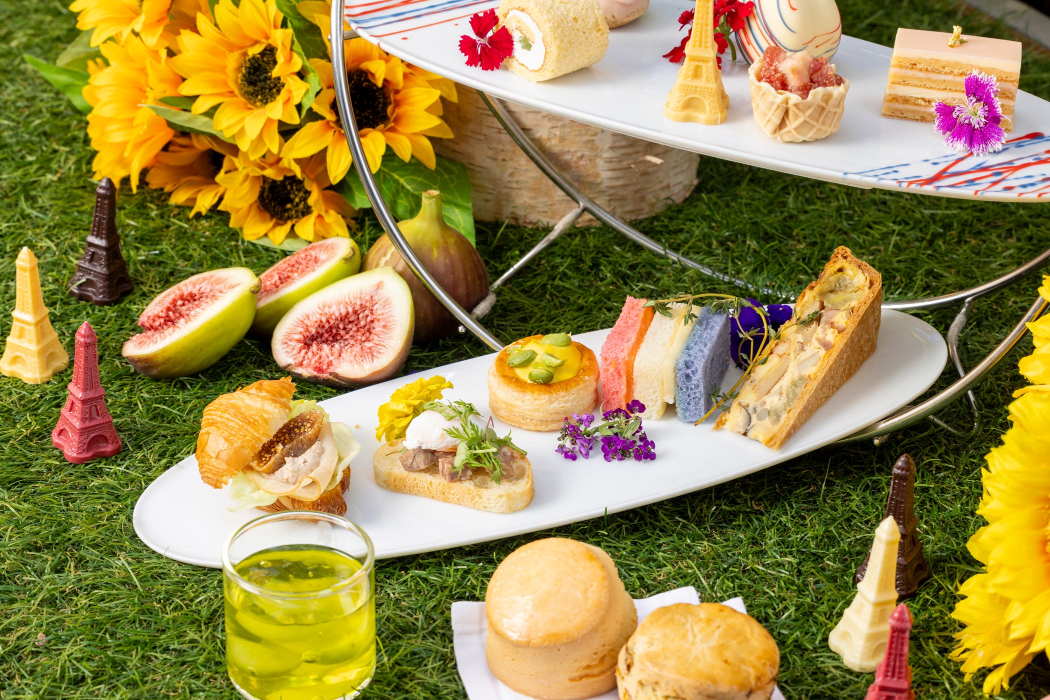 甘美なピーチが香るガトーオペラピーチとルリジューズピーチや、シャインマスカットの豊かな香りと甘みを活かしたロールケーキとゼリー、ブルボンバニラの風味が広がるカスタードをつかったイチジクバスケットなど、甘すぎない上品な味わいのスイーツが並びます。セイボリーには、桜の木のスモークチップで7~8時間かけて燻製する自家製のスモークサーモンと、シャインマスカット、カマンベールチーズでつくるトリコロールサンドや、スモークターキーにイチジクを合わせたクロワッサンサンドなどフランスを感じるメニューをご用意いたします。