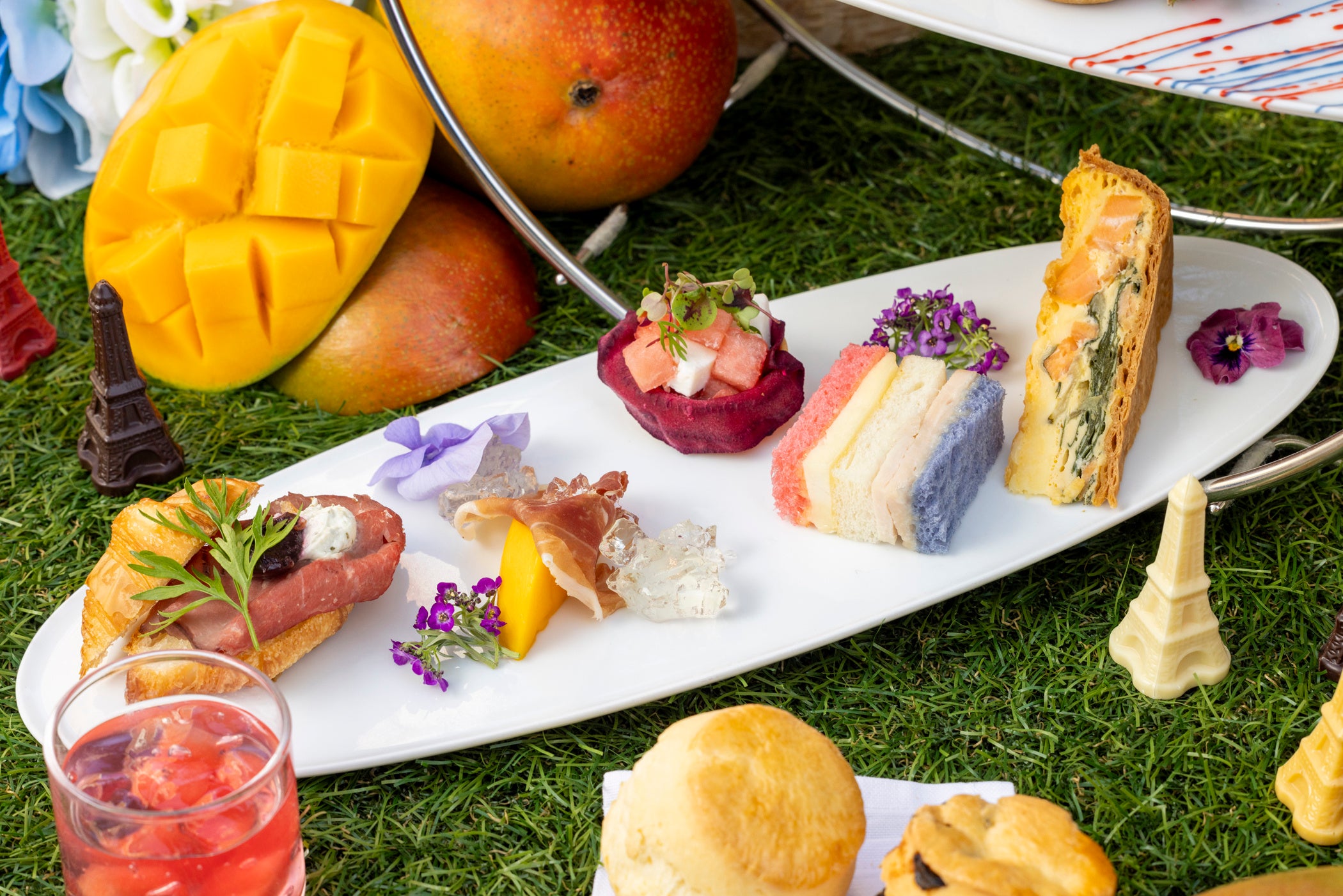まろやかなマンゴープリンをとじ込めたルリジューズマンゴーや、甘酸っぱいアメリカンチェリーのガナッシュがアクセントとなったリッチな味わいのガトーオペラチェリー、サクサクのワッフル生地にみずみずしいメロンを贅沢に詰めたバスケットなどのスイーツがそろいます。また、マンゴーを合わせたイベリコハムや、チェリーのコンポートを添えたローストビーフなど、セイボリーにも旬のフルーツを忍ばせています。
