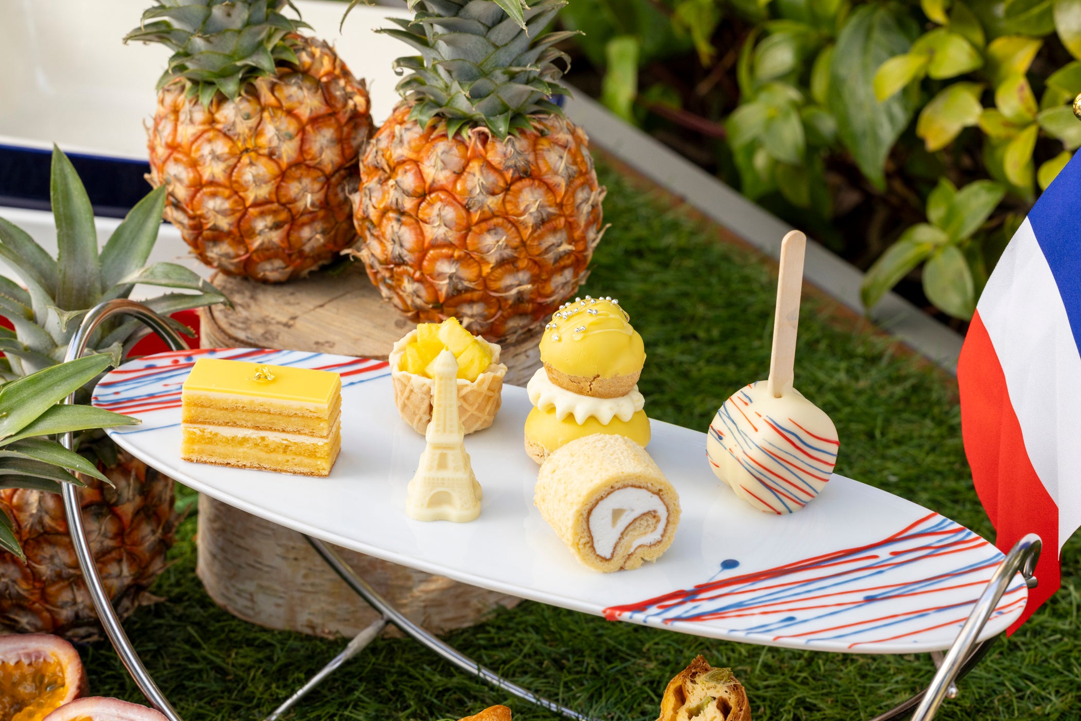 7月1日(月)~7月31日(水)のセカンドシーズンでは、パッションフルーツ、パイナップル、ピーチをつかったメニューが並びます。自家製のマンゴーとパッションフルーツのアイスクリームをサンドしたマカロンをホワイトチョコレートでコーティングしてつくるロリポップや、みずみずしいピーチを閉じ込めたローズ風味のゼリーなど、夏らしい味わいをご堪能ください。