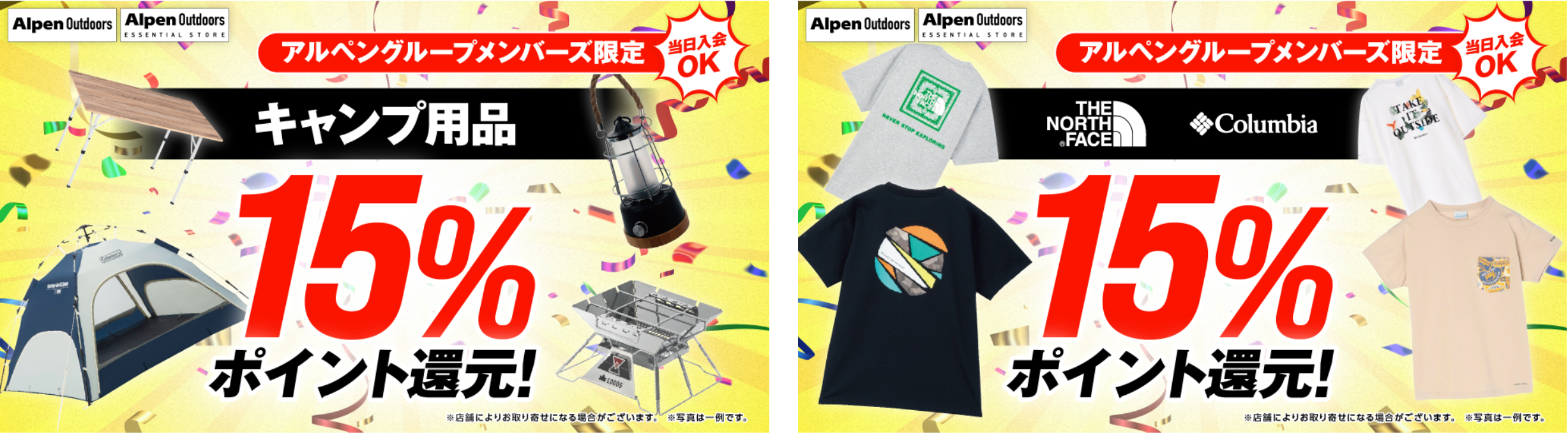 ・キャンプ用品がアルペングループメンバーズ限定(即日入会OK)で15%ポイント還元。
