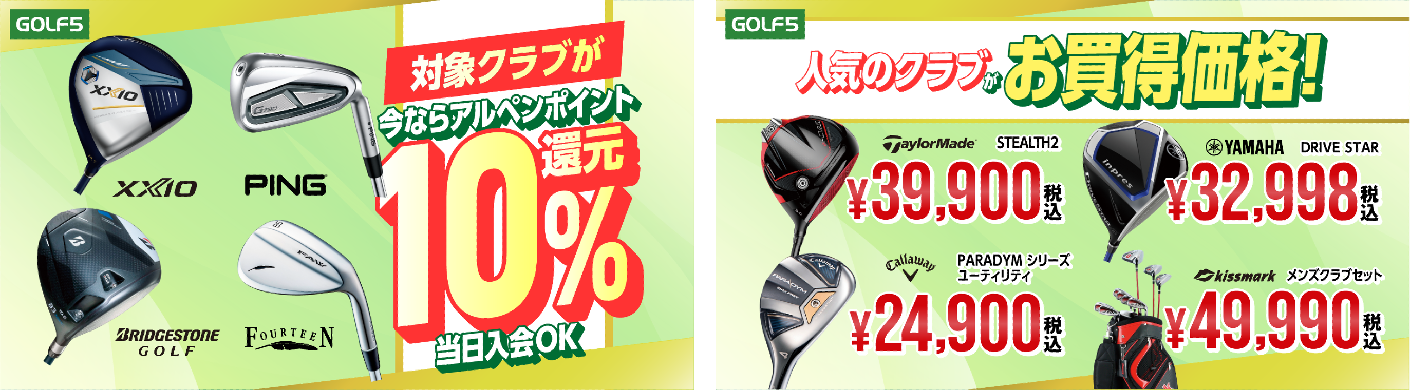 ・アルペングループメンバーズ限定(即日入会OK)で対象の新品ゴルフクラブ、ゴルフシューズ、ゴルフボールは10%ポイント還元。