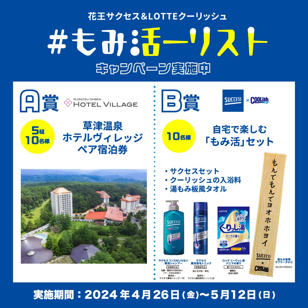 また、「草津温泉 ホテルヴィレッジ」の無料宿泊券や、自宅のお風呂でも「もみ活」を楽しめるオリジナルグッズをプレゼントするキャンペーンも実施します。