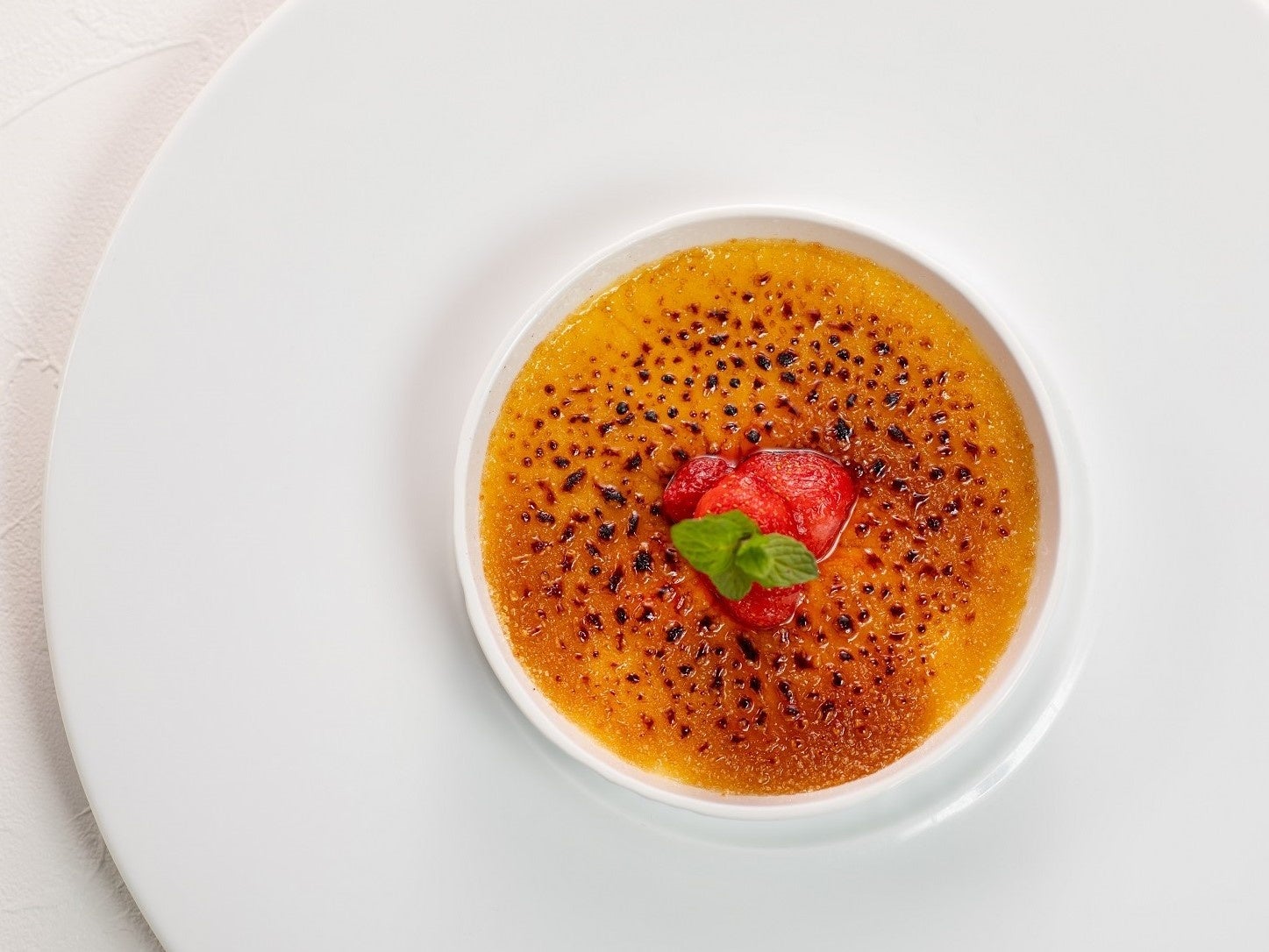 ●京都産卵と植物性ミルクのクレーム・ブリュレ 京都で収穫した季節のフルーツコンポート