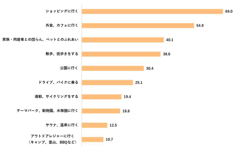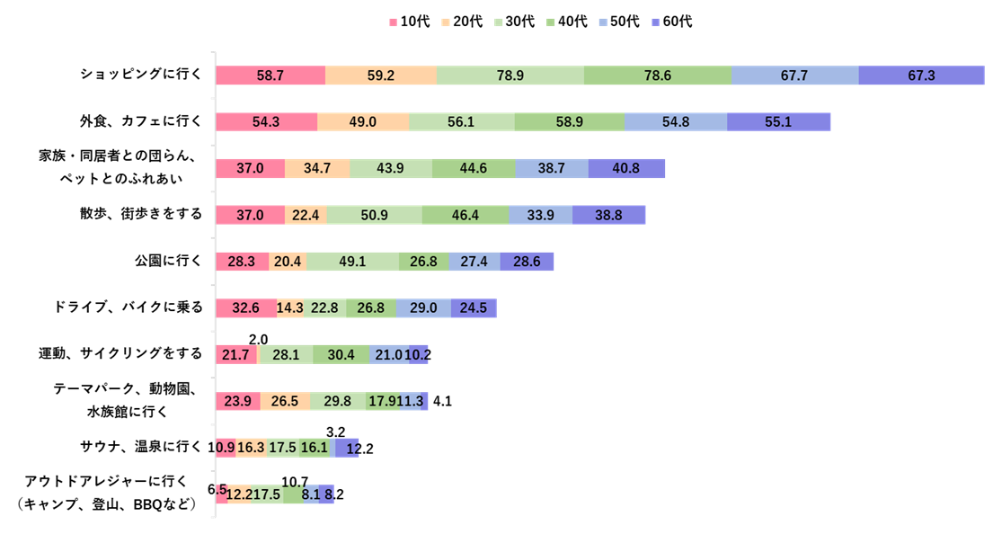 年代別で見ても、全ての年代で「ショッピングに行く」がトップ、次いで「外食、カフェに行く」となった。