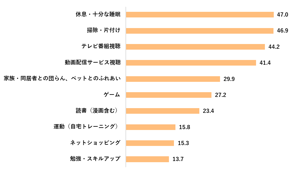 全体では「休息・十分な睡眠」「掃除・片付け」が上位となり、それぞれ約5割だった。