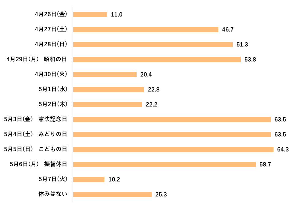 今年のゴールデンウイークの休暇予定日を聴取した。5月の祝日(3~5日)の休暇予定者が多く、各日で約6割が休む予定であることが分かった。4月30日(火)~5月2日(木)の平日3日間を休むと最大10連休になるが、休暇予定の割合は各日約2割に留まった。
