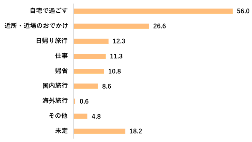 ゴールデンウイークの予定は、1位「自宅で過ごす」(56.0%)、2位「近所・近場のおでかけ」(26.6%)、3位「日帰り旅行」(12.3%)
