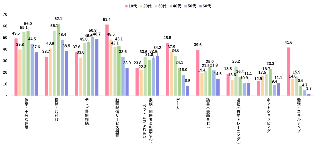 自宅での過ごし方は、10~20代では「動画配信サービス視聴」、30~40代では「掃除・片付け」、50~60代では「テレビ番組視聴」がトップとなり、年代による違いが見られる