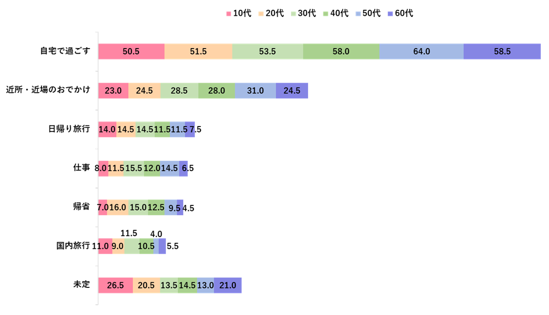 年代別で見ると、全ての年代で「自宅で過ごす」が半数を超えた。