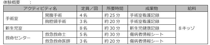 体験内容 :患者の手術、新生児のお世話、救命処置、病気やけがの人を救急車でかけつけて処置をする