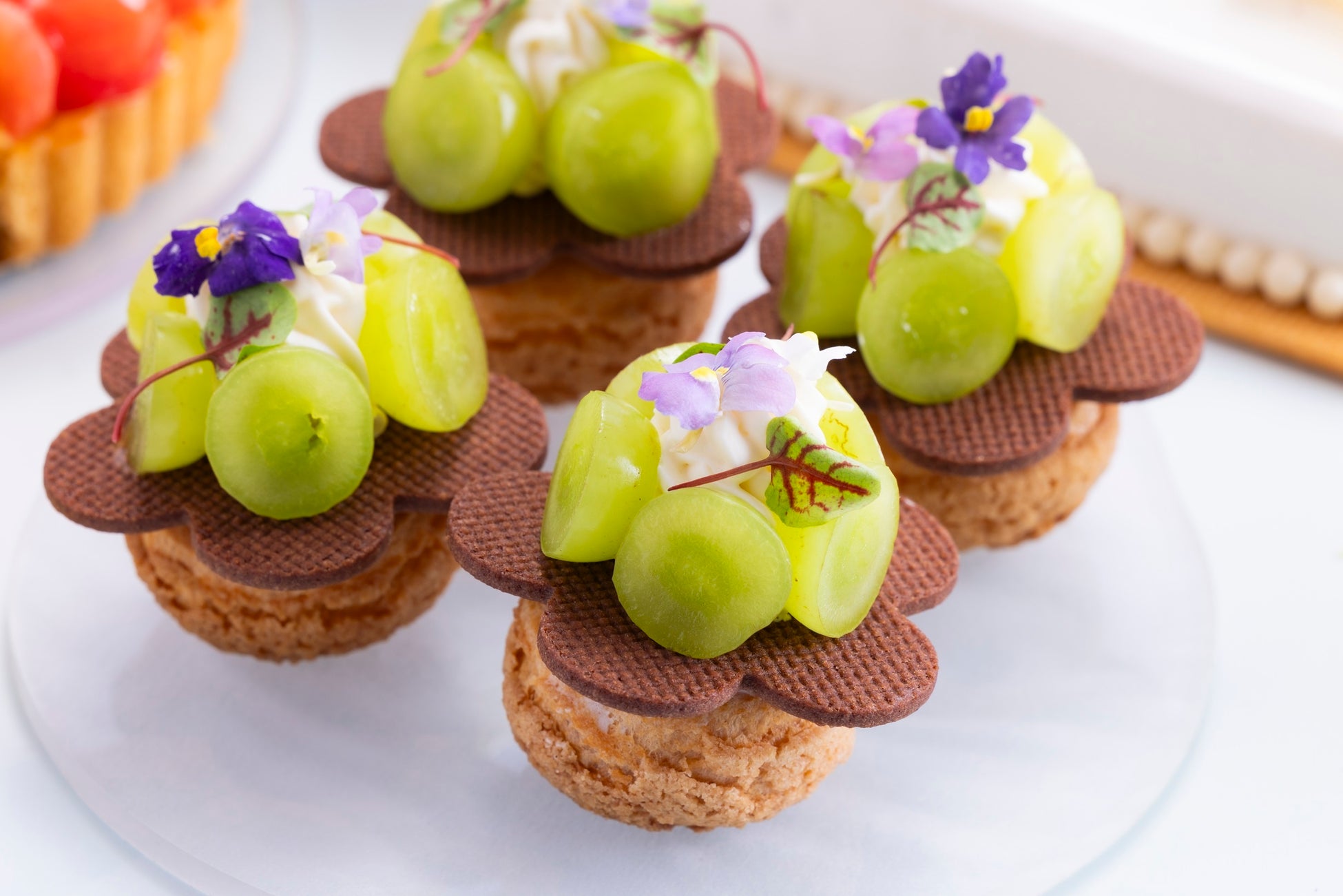 マスカットとチョコレートサブレでドレスアップしたシュークリーム「マスカットシュープラネット」には、バジルとミントの隠し味が独創的。ほかにも空をモチーフにしたスイーツには、「三日月フルーツパブロヴァ」や「風船がとんだプリン」などバラエティ豊富にご用意いたします。