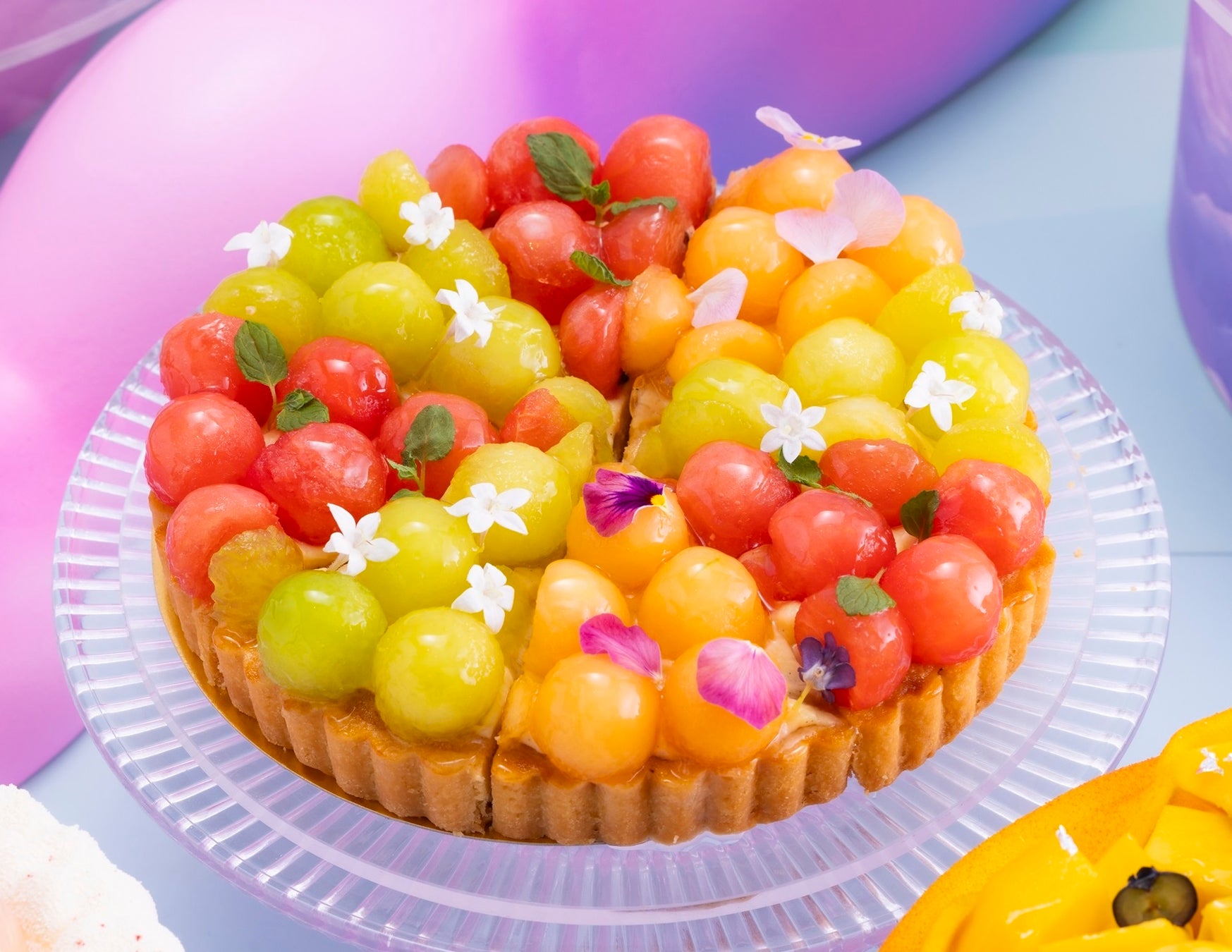 雲や飛行機などが装飾された空間の中で、ひときわ目をひくカラフルな「ころころ果実タルト」は、グリーンメロン、レッドメロン、ウォーターメロン(スイカ)を丸くくりぬいて、香ばしいタルトの上にたっぷりと飾った夏らしい色合いに気分が上がります。