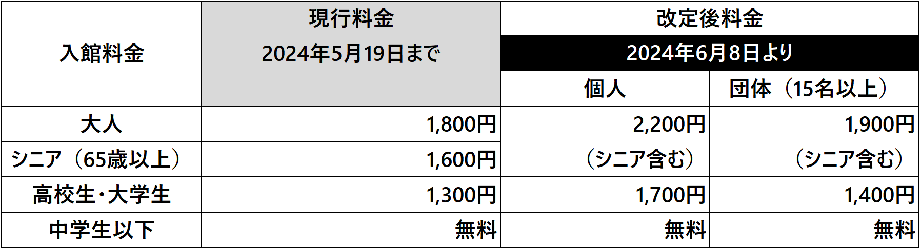 2024年6月8日より、入館料金を下記の通り改定いたします。(すべて税込、団体割引あり)