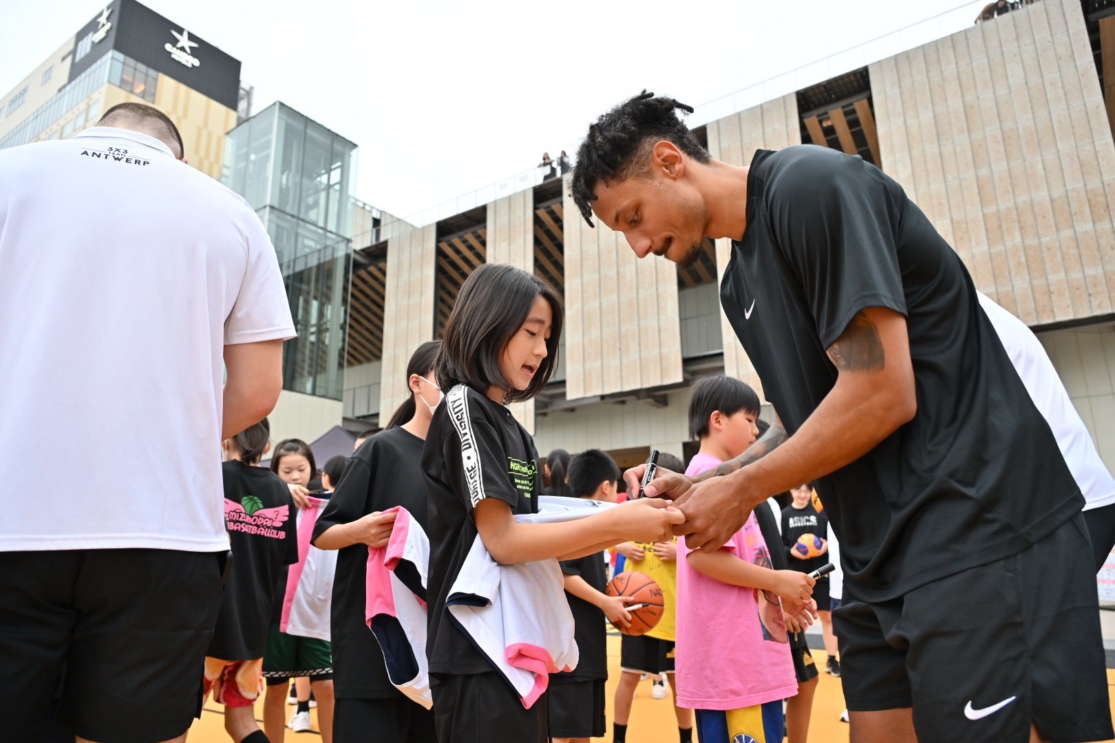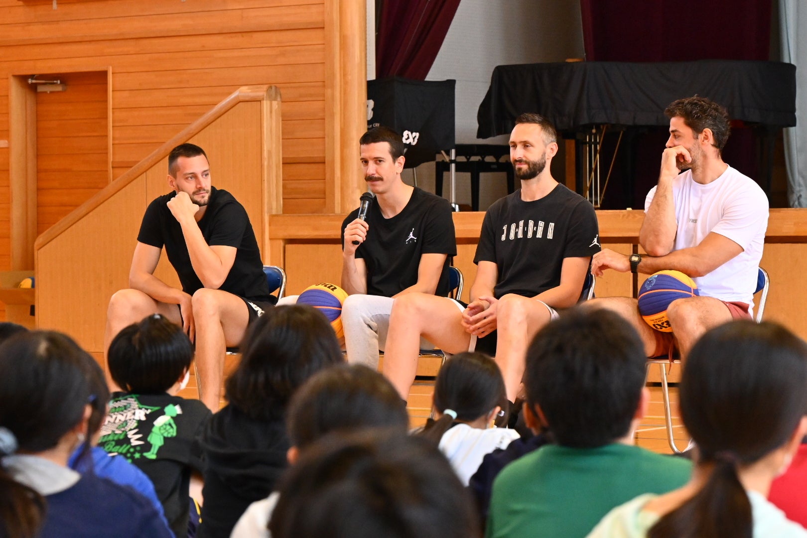 また、大会前日の4月26日(金)には、宇都宮市立桜小学校にUB(ウーブ)の選手たちが訪問し、デモンストレーションや質問コーナー等、子供たちと交流。子供たちからはサインのリクエストやハイタッチを求める姿など、2m級の大きな選手たちに憧れのまなざしを向けていました。選手たちもその視線に応えるように、笑顔で挨拶やハイタッチを実施。言語の壁を越えた素敵な時間が、そこには流れていました。