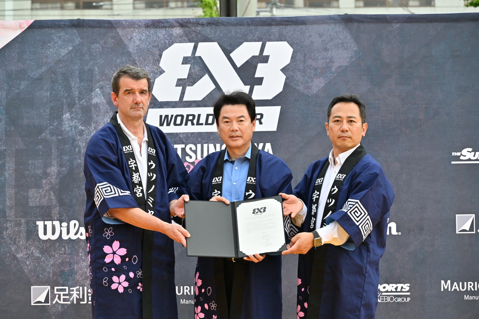 JR宇都宮駅東口に、2022年11月末に新たなシンボルとして誕生した「宮みらいライトヒル」「ライトキューブ宇都宮」。大会と同期間中、4月26日(金)には、来年2025年~2028年まで、FIBA 3×3 World Tour Utsunomiya Openerの開催決定に関する調印式を、宇都宮市の佐藤市長とFIBA3x3ディレクターのアレックス・サンチェス氏、3×3のまち宇都宮推進委員会の副委員長・中村考昭氏の3名で実施。調印式では、FIBA3x3公式戦でも使用されているコートを、「UTSUNOMIYA」と大きく記載し宇都宮市のシンボルカラーであるイエローにアレンジされたもので寄贈されました。加えて、大会に出場するチームとの交流会「3×3 Fan FEST」をはじめ、U-12世代を対象とした「3×3 Jr CUP」、「WOMEN’S CHALLENGE presented by 3×3.EXE PREMIER」、「二荒山神社で行われているWorld Tour本戦のパブリックビューイング」など、さまざまな関連イベントが行われました。