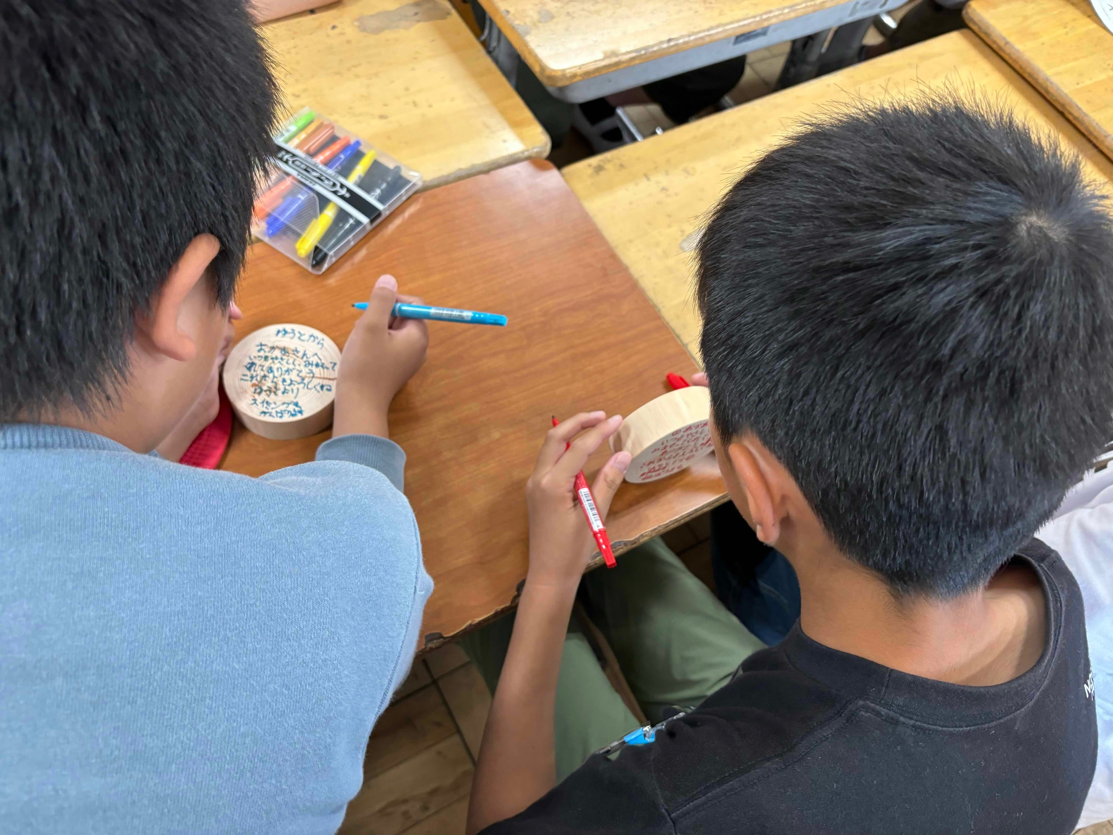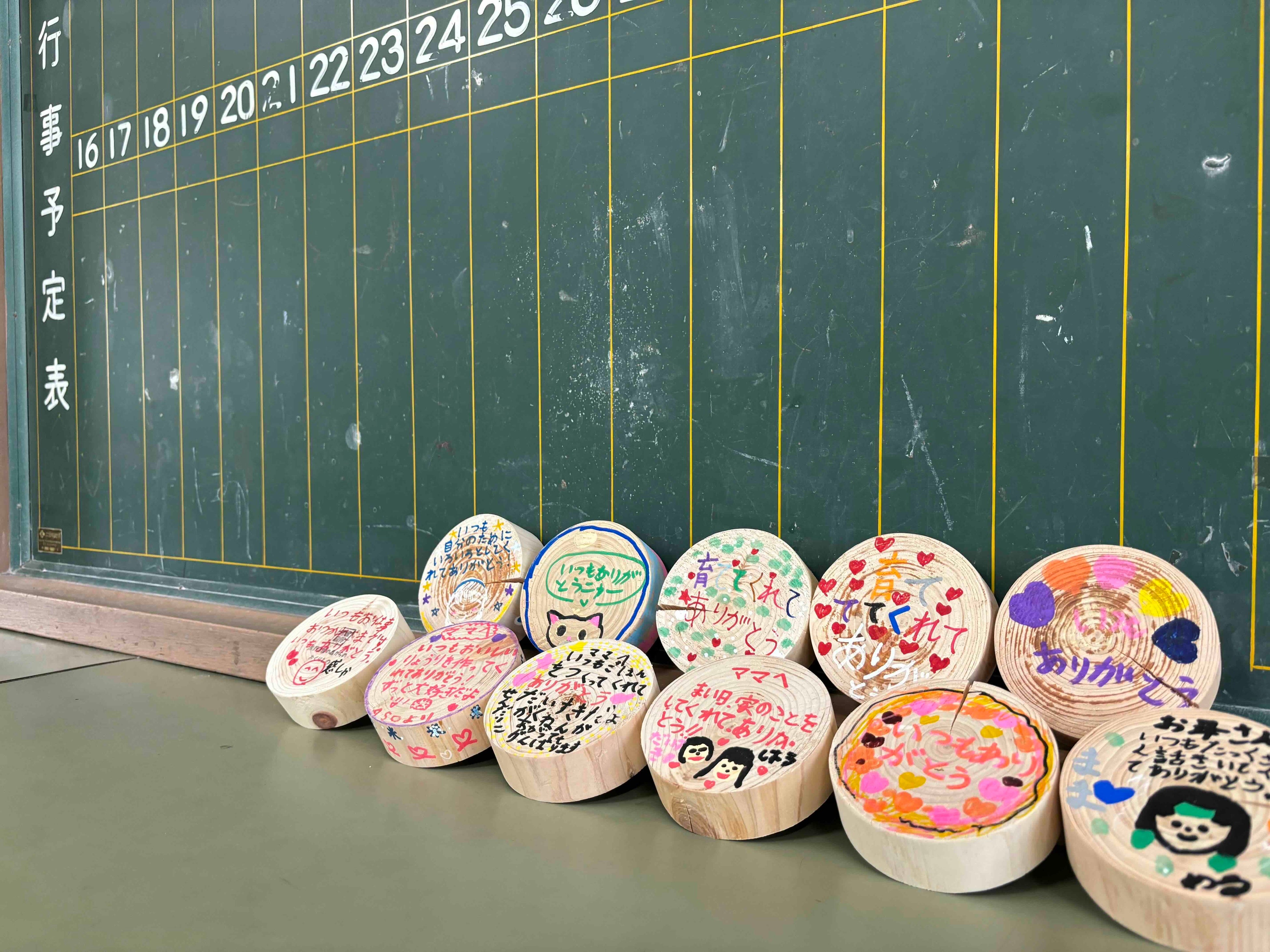4月23日に熊谷の玉井小学校を訪問し、子供たちからのメッセージをヒノキ入浴木に記入していただきました。