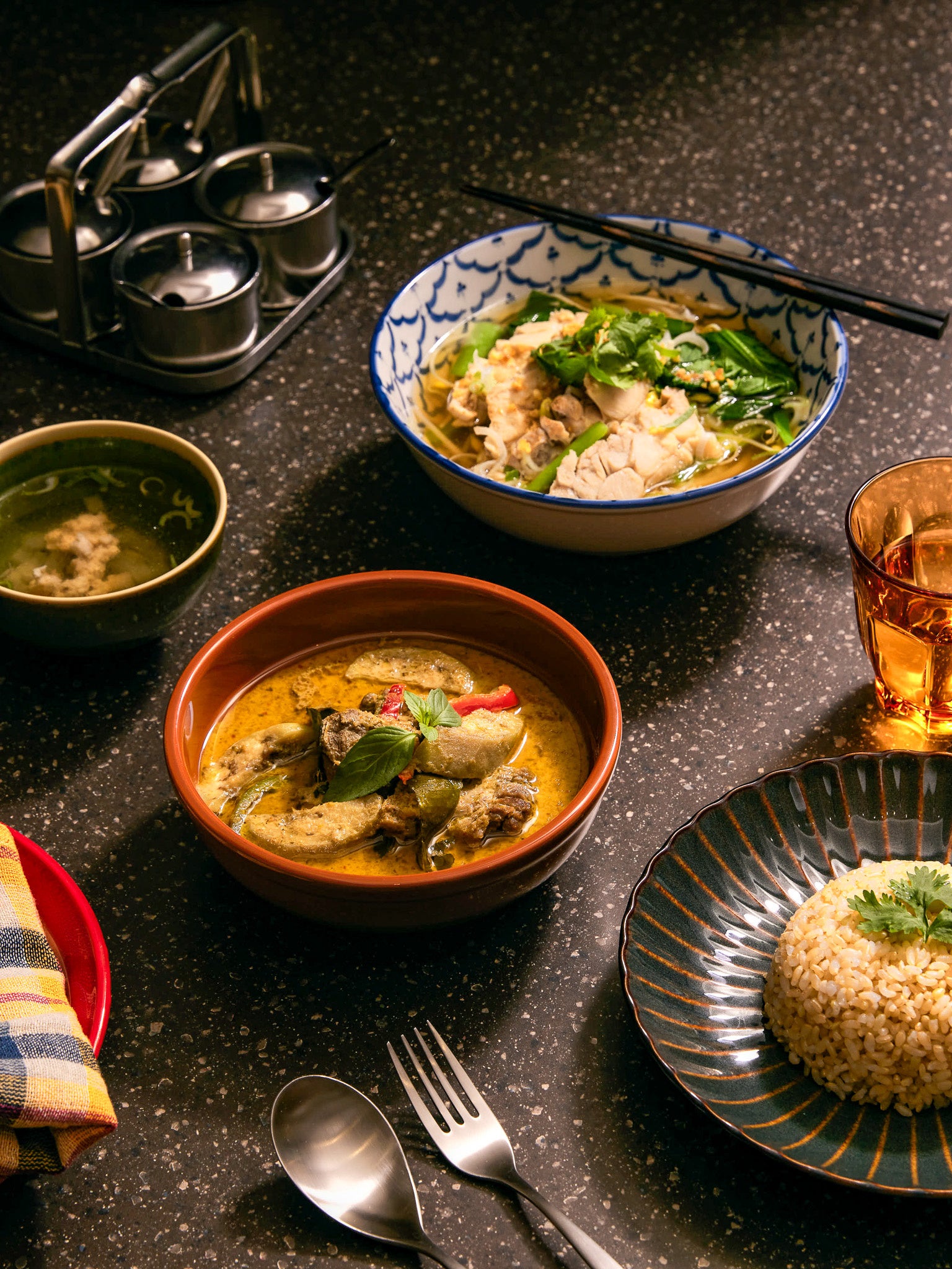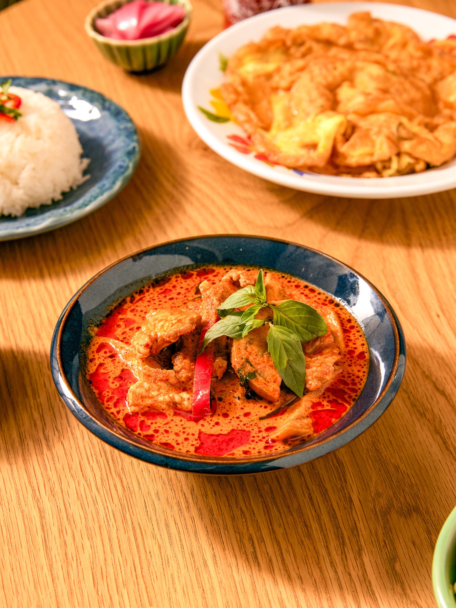 リッチでバランスの取れた、複雑な風味が特徴のマッサマンカレーは、ベルベットのように滑らかなココナッツミルクと香ばしいスパイスによる辛さや甘さといった多彩な味覚が口の中に広がり、噛むたびに食欲をそそる贅沢なカレーです。