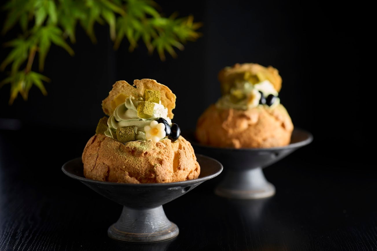 リソルの森の名物スイーツ「シュー・ア・ラ・クレーム」に、抹茶のわらび餅や黒豆を乗せた初夏限定フレーバーが登場。抹茶クリームの中には、爽やかな夏みかんをたっぷりと使ったジュレを入れました。