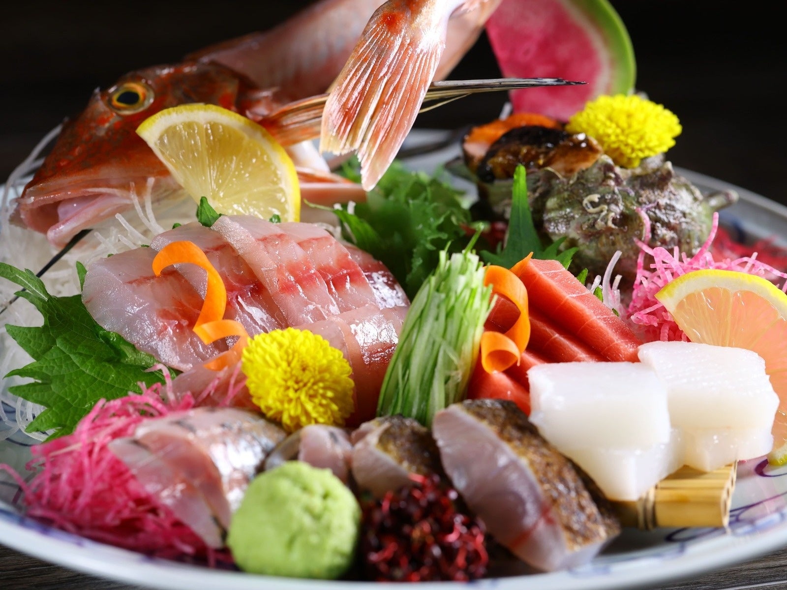 新鮮な海の幸の伊豆近海産刺身の盛合せをお付けします。