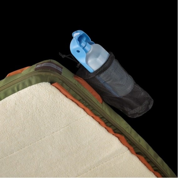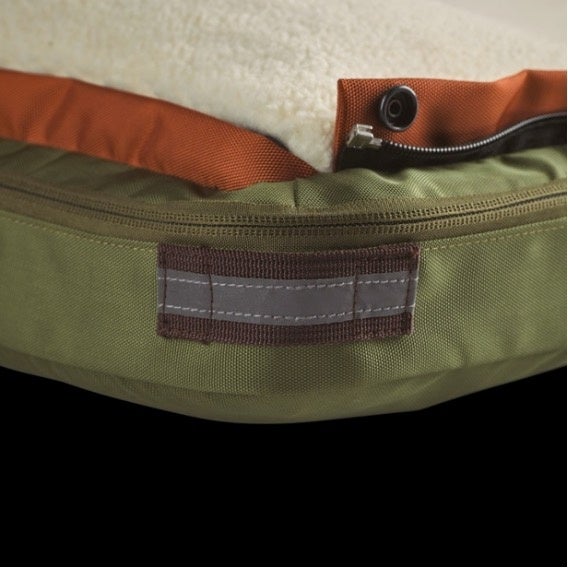 ベッド上部にあるファスナーを開けると、中から寝袋が出現する。サイドの2辺のファスナーを閉じれば、愛犬の寝袋に早変わりだ。足元2ヶ所には通気を可能にするスナップ式のボタンとファスナーも付いているため、愛犬の様子を観察しながら調節が可能。夏にはこの寝袋の上に横たわることで、ひんやりとした感覚が得られるため、愛犬の温度調整がほぼ3シーズン可能ということになる。また、ベッド本体の素材は、速乾性に優れたシェルパ・フリースを採用しており、肌触りが良く、毛足が短いので匂いもつきにくい。愛犬の健やかな眠りを促してくれる。