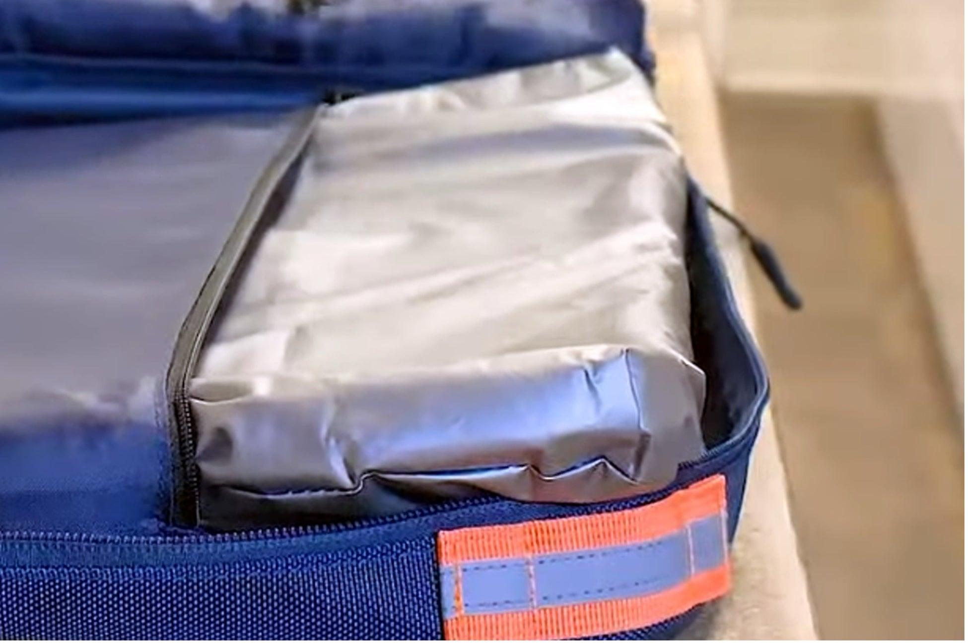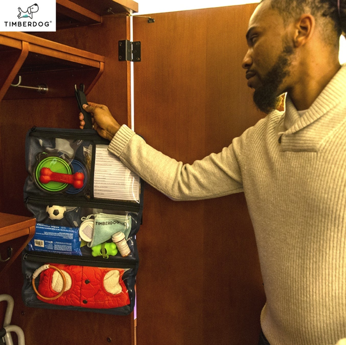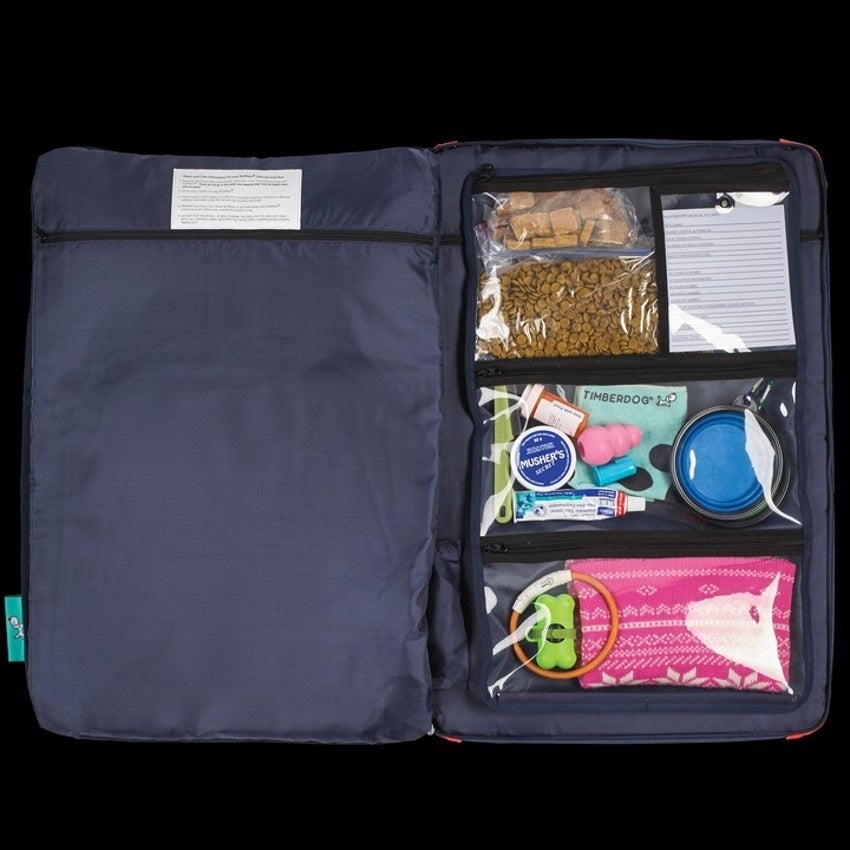 長方形のベッドの3辺のファスナーを開けると中にはオーガナイザーが備わっている。中身が一目でわかる透明な仕様で、ジッパーで密封が可能な分室構造。スモールサイズには3室、ミディアムサイズ・ラージサイズには4室ついている。数日分の非常食、薬、おやつやトイレシート、おもちゃが収納可能。持ち手がついているので、クローゼットやドアノブに引っ掛けられる。このオーガナイザーをベッド内部に入れ、ファスナーを閉めれば一瞬にして愛犬の必要アイテムと共に移動が可能。非常時は言うまでもないが、出がけの支度が煩雑になりがちな小さい子供がいるご家庭、また、キャンプなどアウトドアへ行く際の荷造り、荷下ろしが簡略化されることは間違いない。