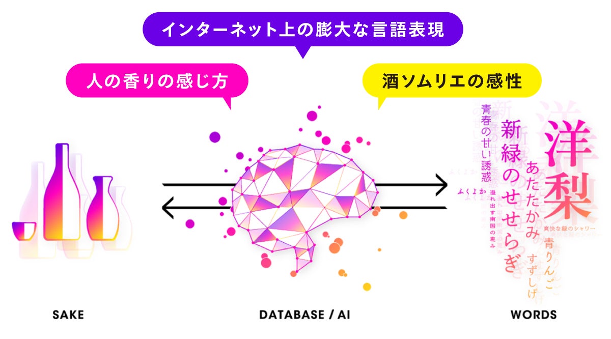 日本酒ソムリエAI「KAORIUM for Sake」は、膨大な言語表現と人の香りの感じ方に合わせて、1万以上の日本酒の風味・感性データと酒ソムリエの感性を学習した最先端のAIシステムです。AIが持つ膨大な日本酒の風味データによって、最高の “人とお酒” のマッチングを導き出すことができます。
