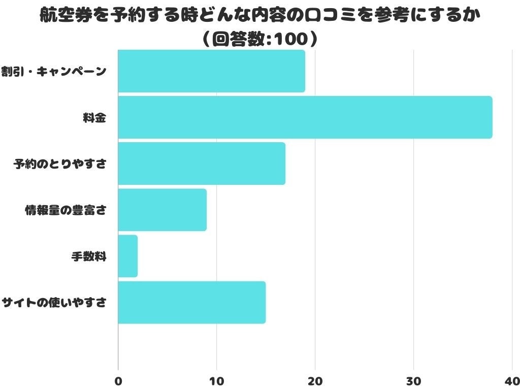 航空券を予約する時どんな内容の口コミを参考にするかをアンケートにて調査したところ、1位は「料金」でした。