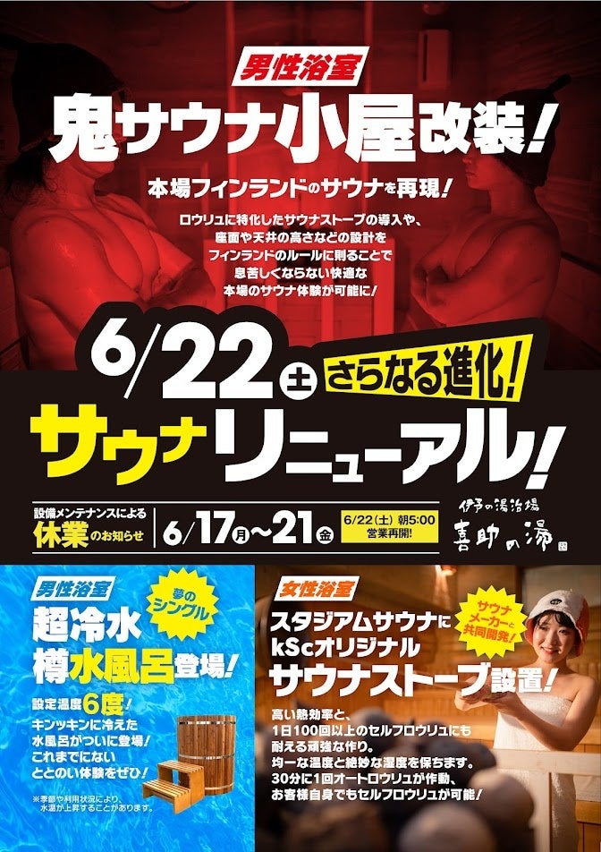 2024年6月22日(土)に『伊予の湯治場 喜助の湯』のサウナ エリアリニューアルを記念して、コンテストの結果発表も行われます。