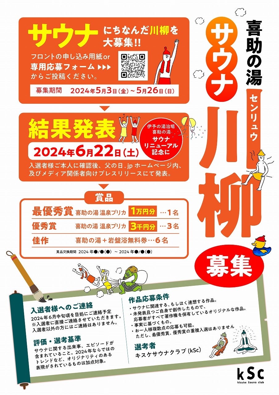 愛媛県松山市を拠点に展開する総合エンターテイメント企業、キスケ株式会社(代表取締役:山路義則)は、正岡子規の生誕地であり、日本の俳句文化にとっての聖地です。この松山で新たな文化的試みとして、2024年5月3日から「サウナ川柳コンテスト2024」を開催します。